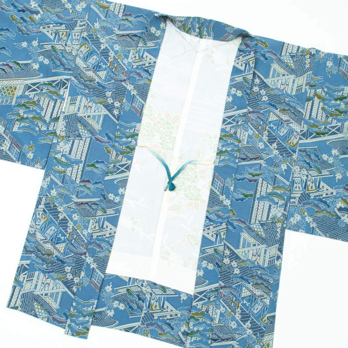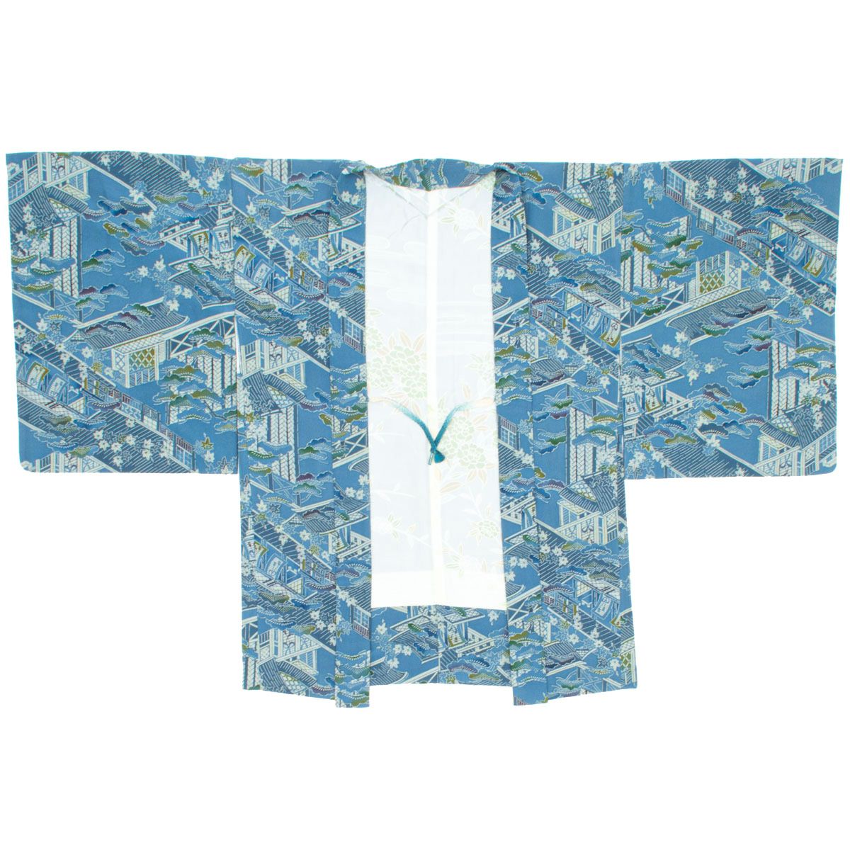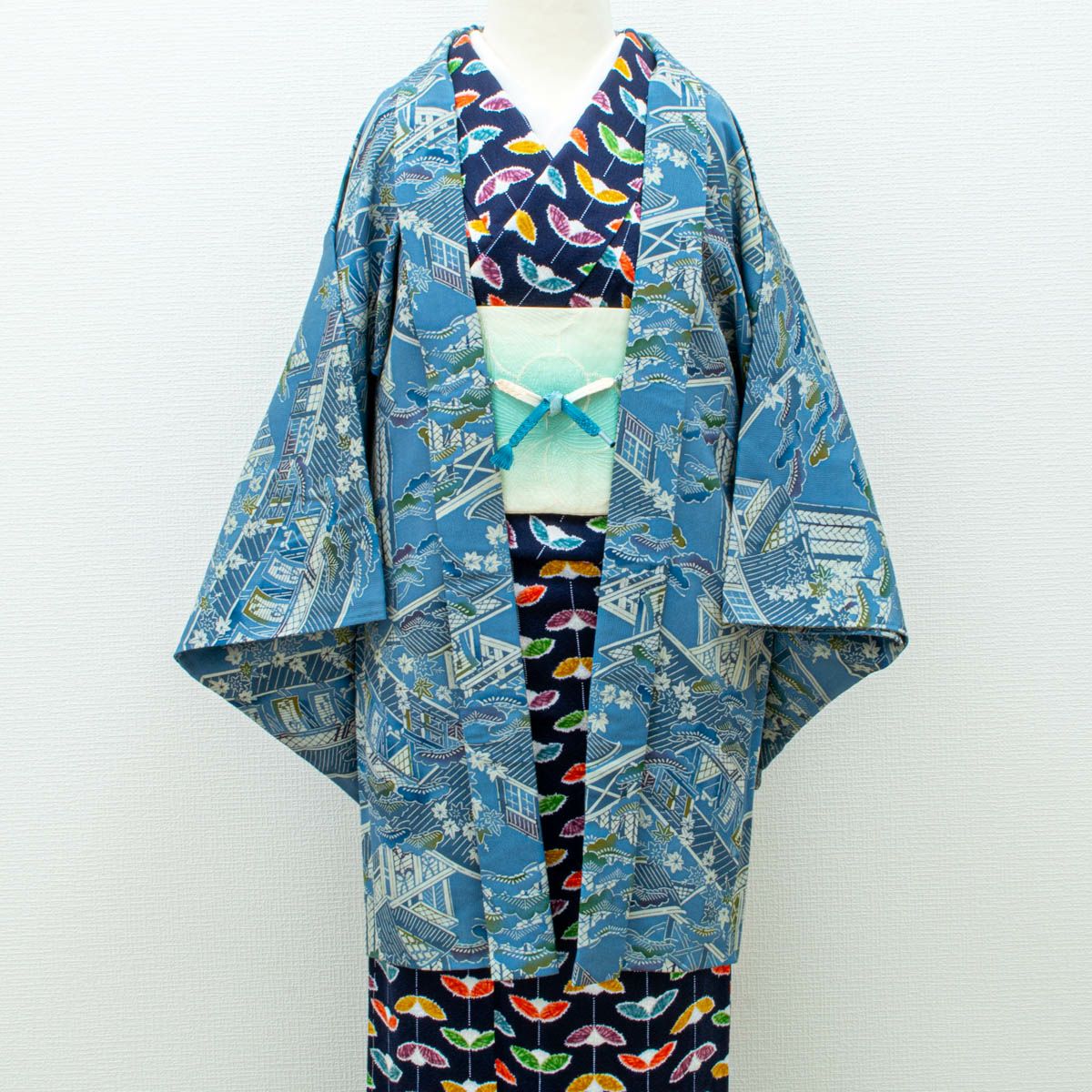 羽織 型友禅 江戸解き文様 青 羽織紐付き 正絹 袷 身丈:約79cm 裄:約64.5cm