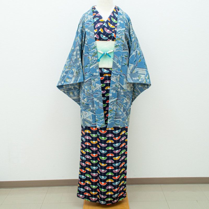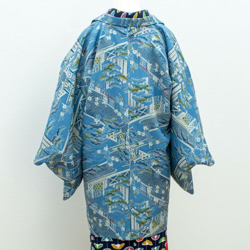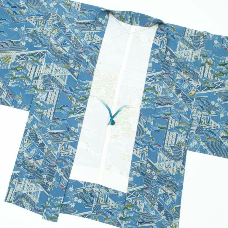 羽織 型友禅 江戸解き文様 青 羽織紐付き 正絹 袷です。