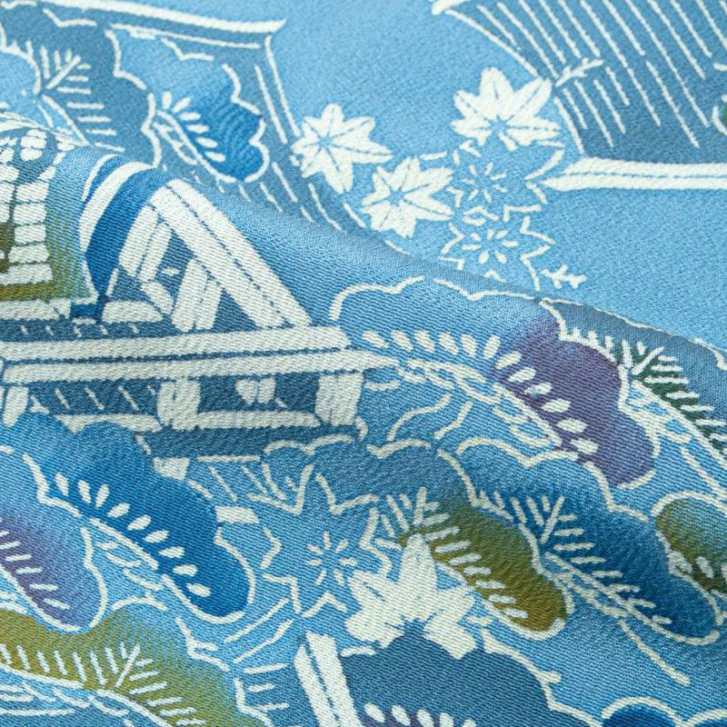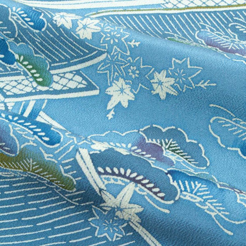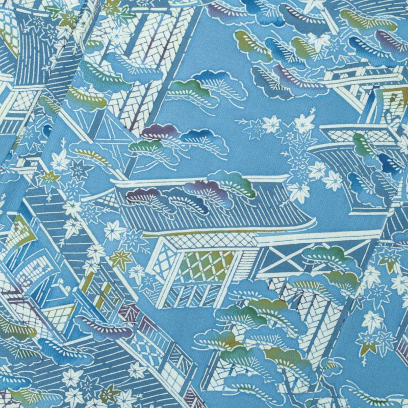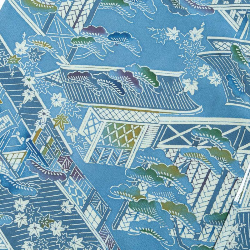 瀟洒なお屋敷や土蔵、松の木や紅葉など、細密に描かれた情景が連なり、まるで一幅の絵巻物を羽織っているかのような趣を醸します。