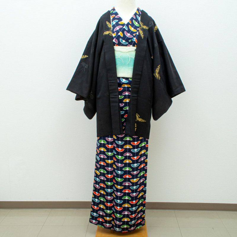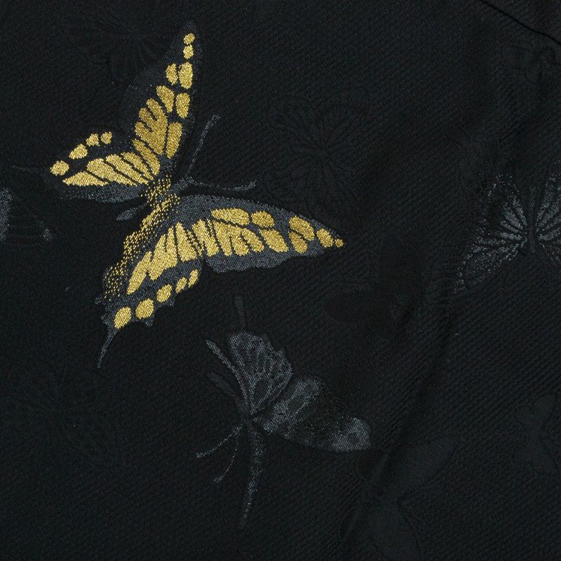 光沢のある黒地に、胡蝶の姿が浮かび上がる印象的な羽織です。
