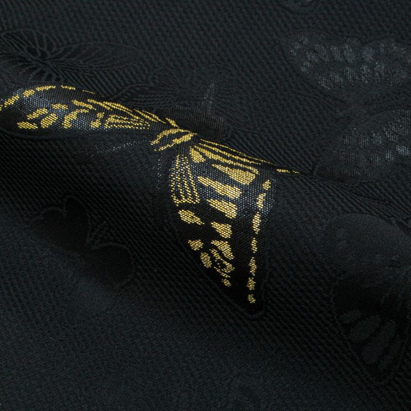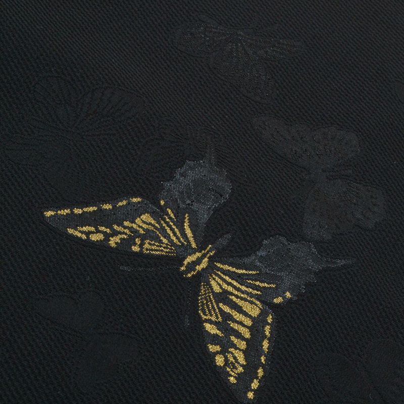 地紋には様々な蝶が織り出され、なかでも金糸・銀糸で織られた鮮やかな胡蝶のポイント柄が美しいアクセントとなっています。