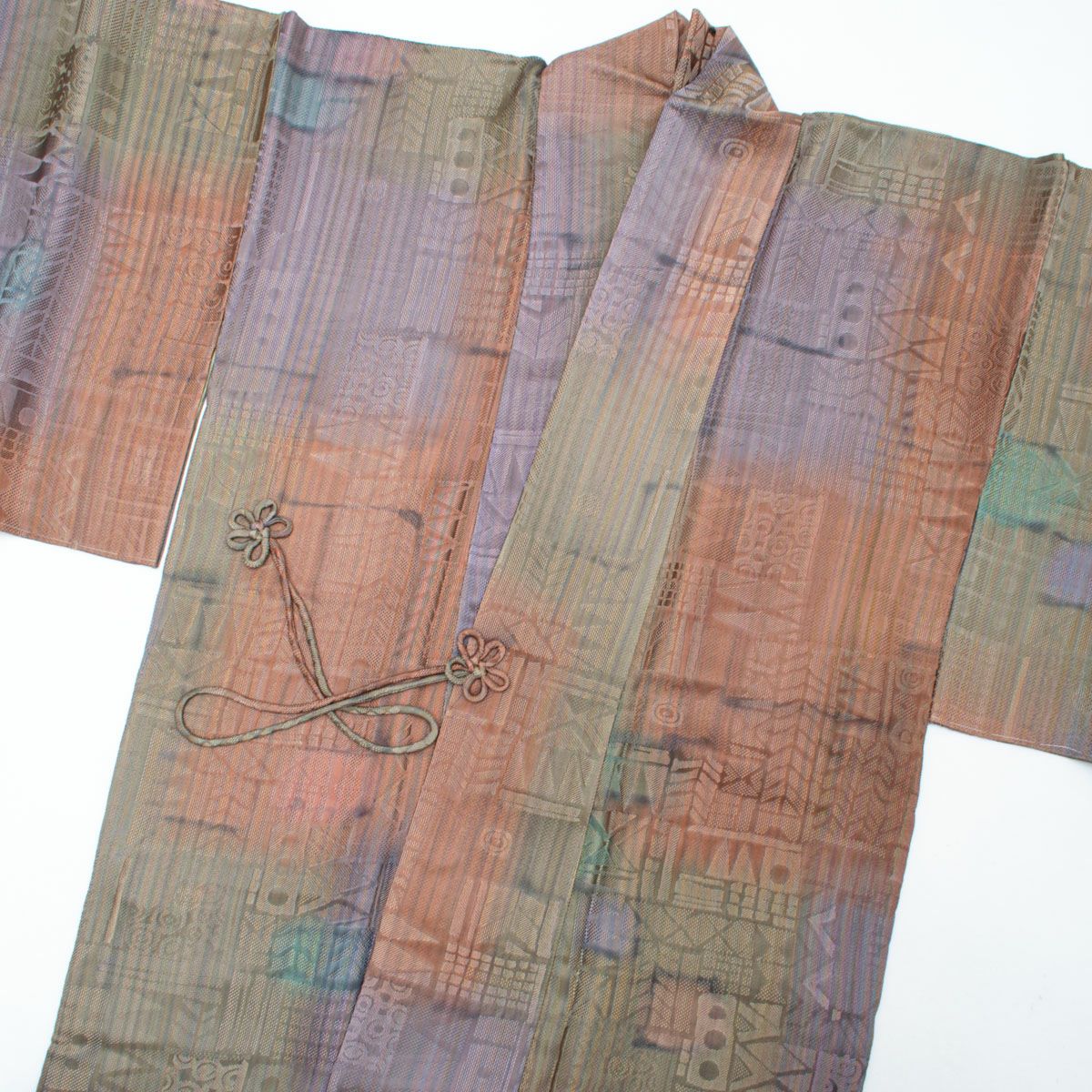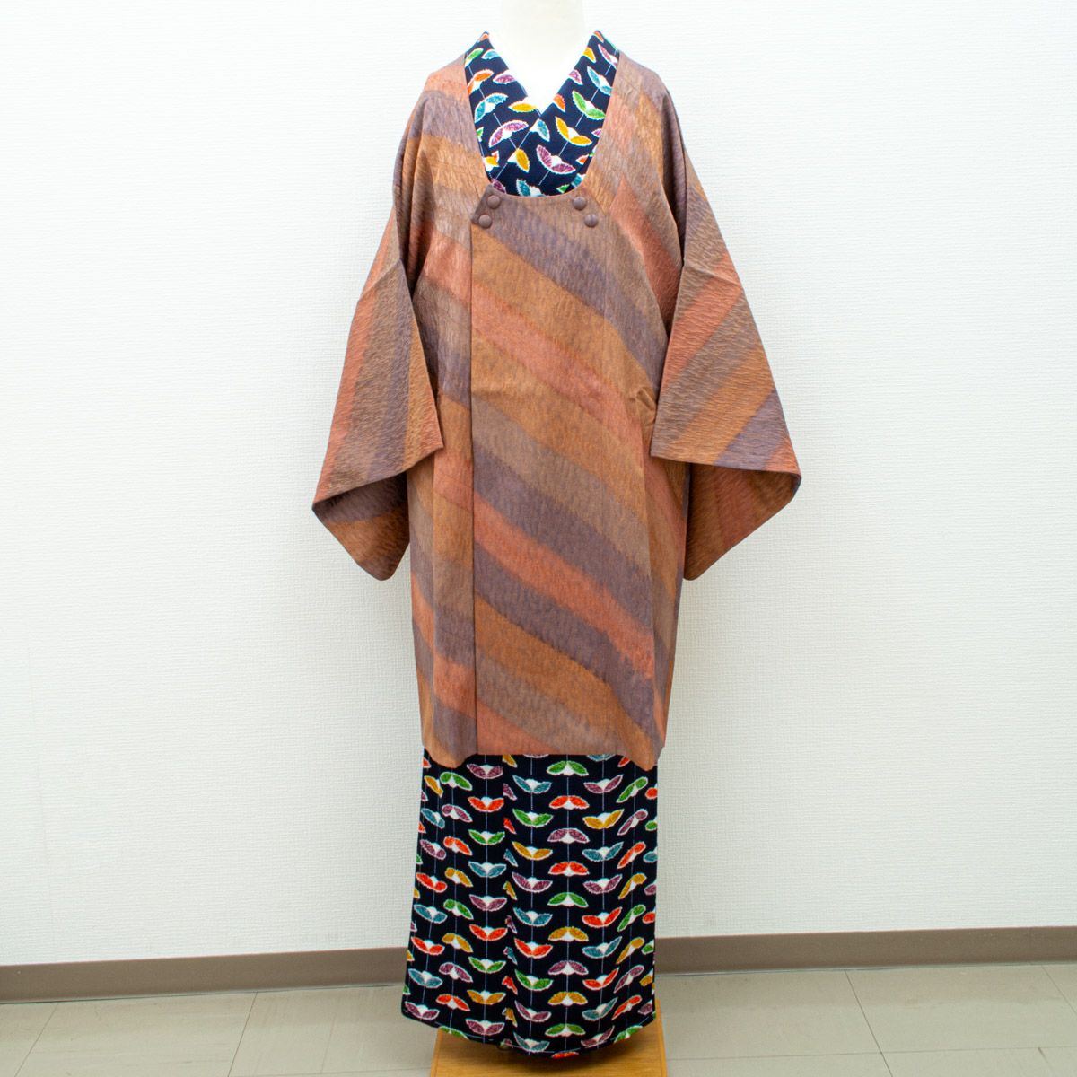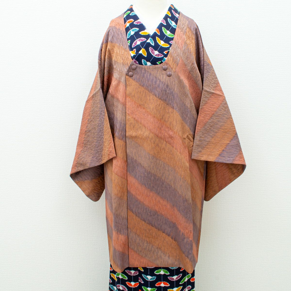 他の画像を見る 道行き 斜め縞 紋意匠 地紋起こし 暈し 染め分け調 橙 紫 緑 赤 正絹 袷 身丈:約89cm 裄:約67cm 当店特別価格 ¥ 8,800 税込 カートに入れる お気に入りに登録する