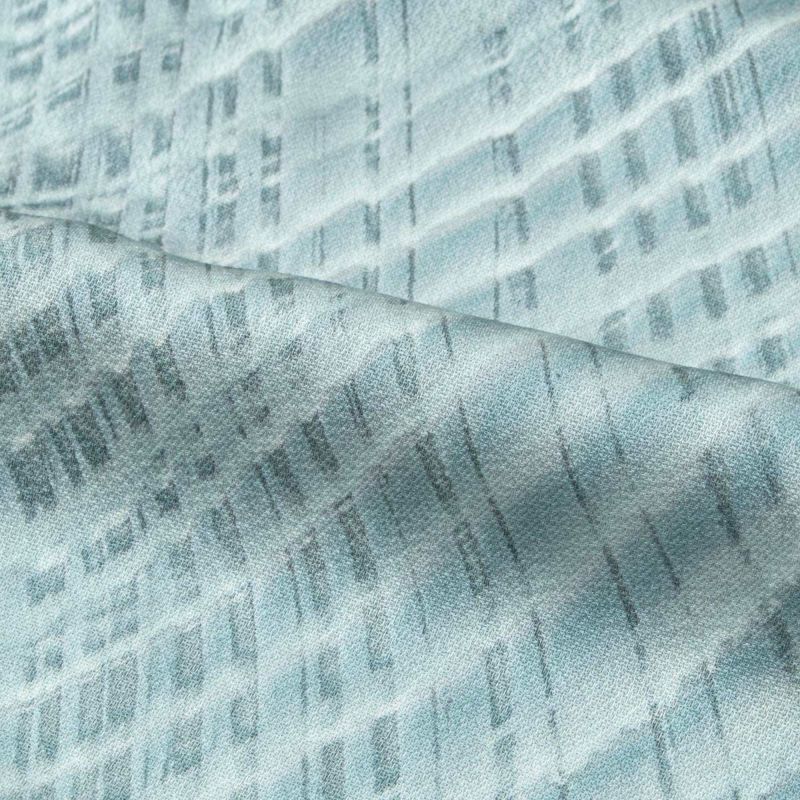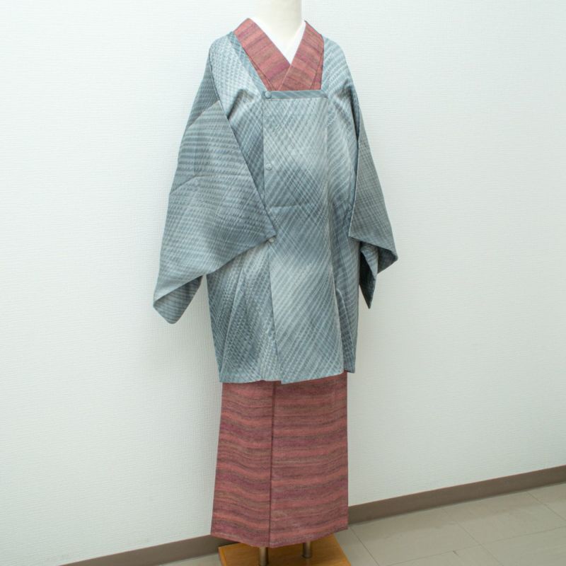 淡い湊鼠色を基調とし、濃淡のグラデーションで奥行きを持たせた格子文様が描かれています。まるで水面に映る光と影を思わせるような柔らかな表情が魅力です。