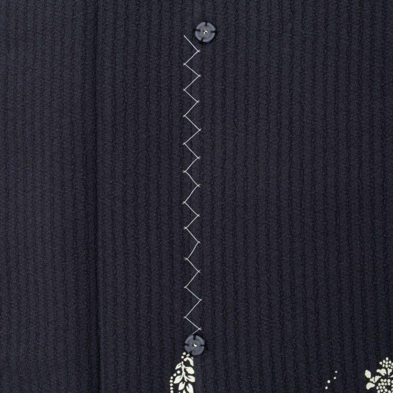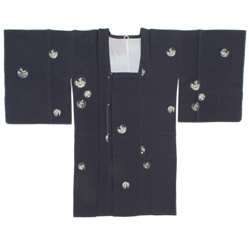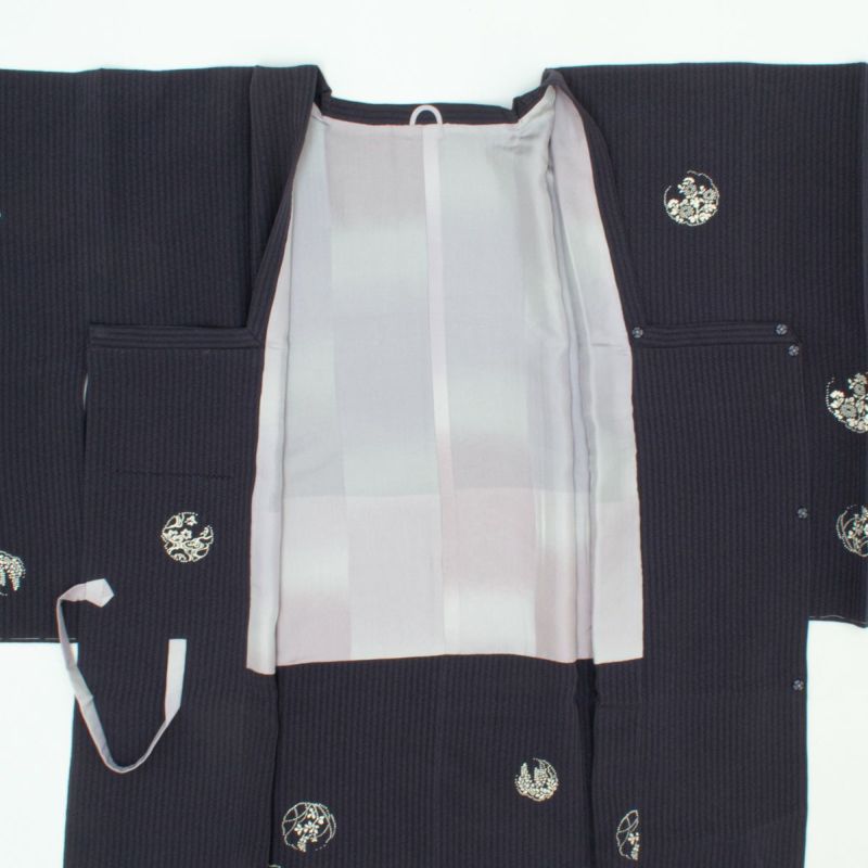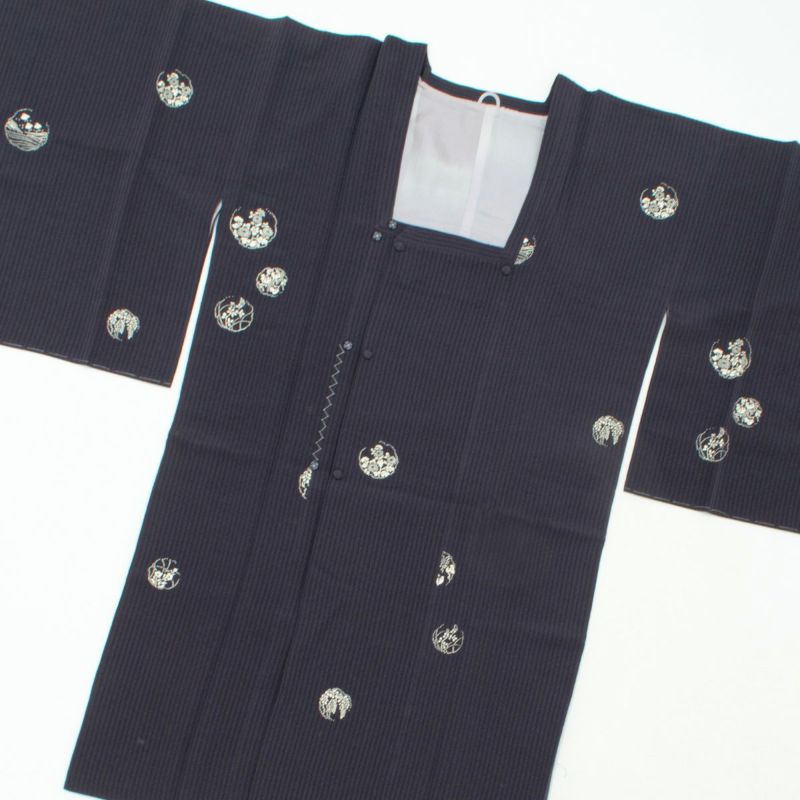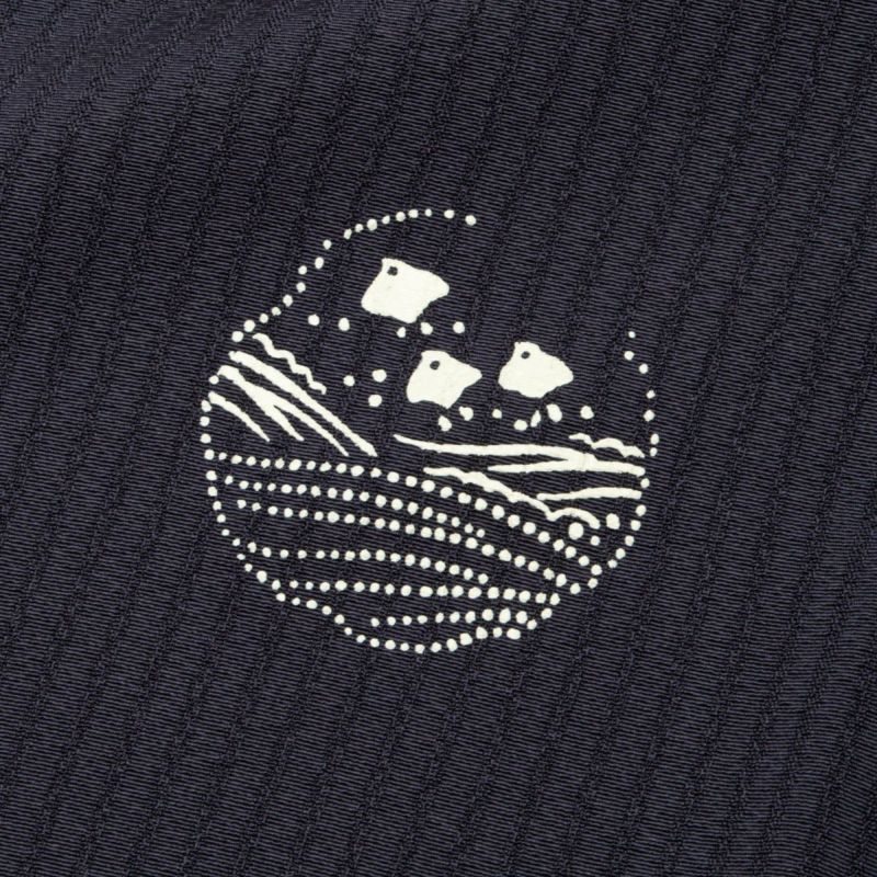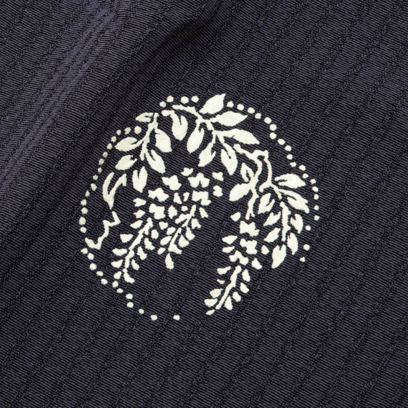 丸文のなかには、千鳥、波文、藤、菊、桜など、四季折々の文様が白一色で染め抜かれ、古典的かつ洒落た趣に仕上がっています。