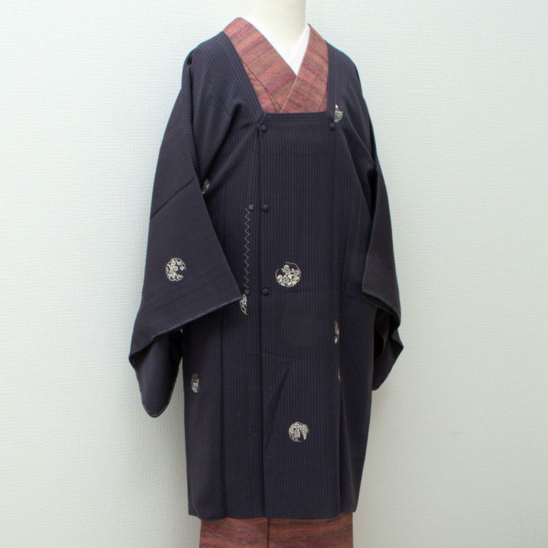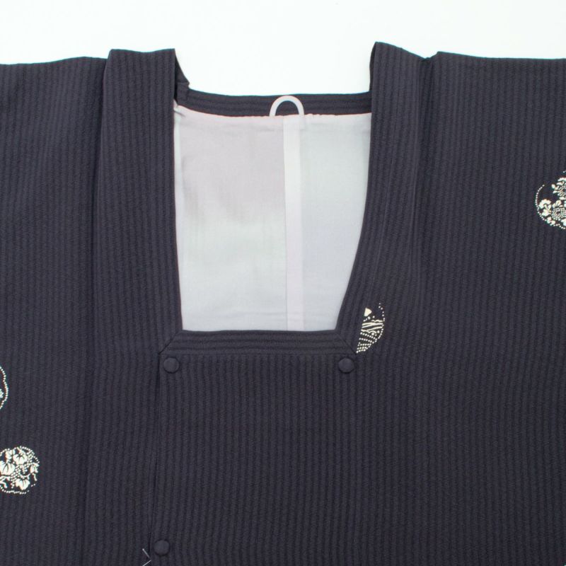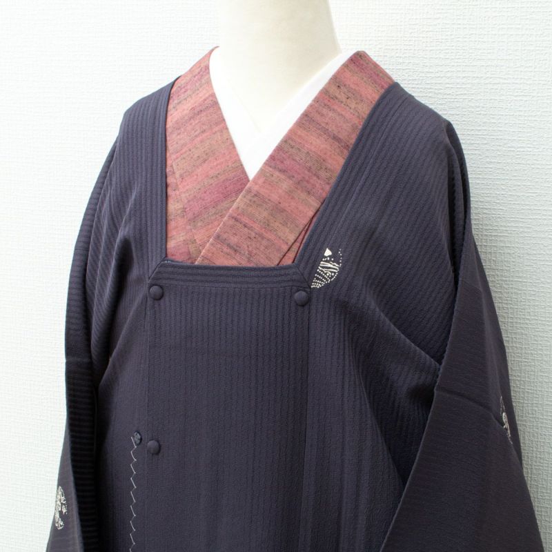 深みのある濃鼠(こいねず)色を基調とした、縦縞の地紋が美しい紋意匠生地の道行コートです。
