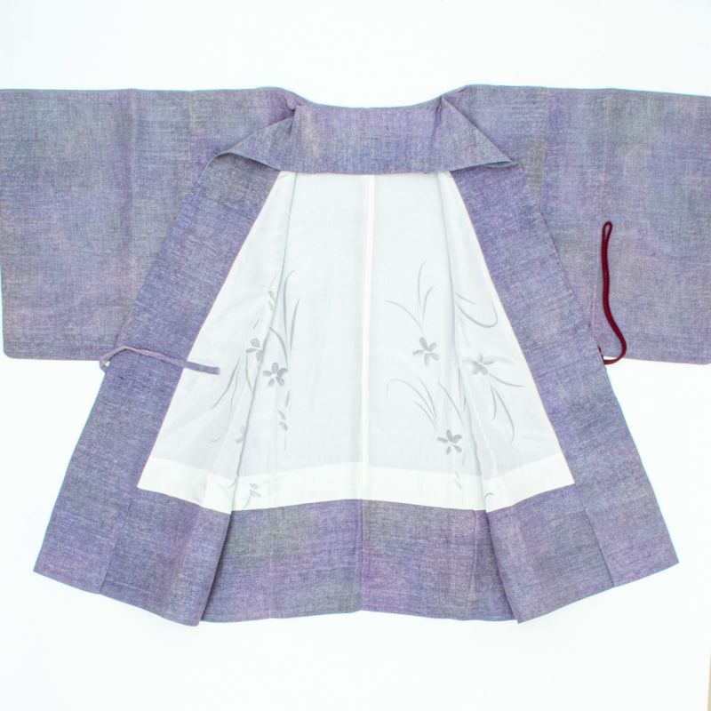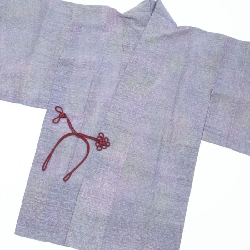 落ち着いた藤鼠色の斑染めのニュアンスが美しい道中着です。