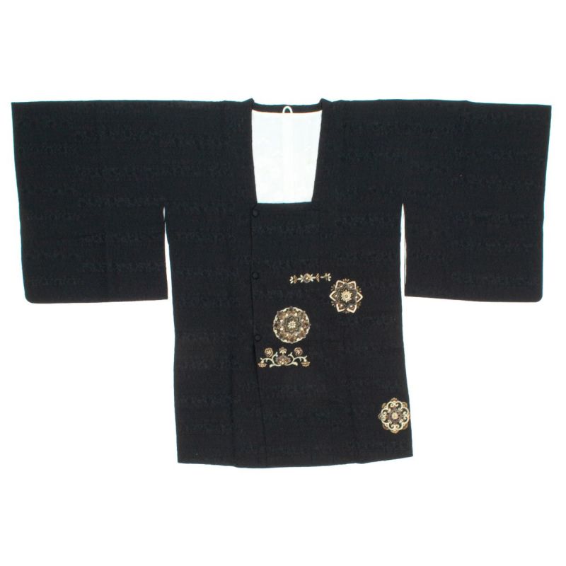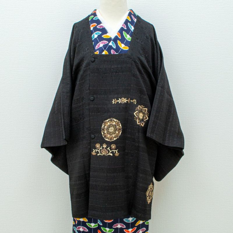 【美品】道行き 膨れ織 紋意匠 汕頭刺繍 唐花紋 金彩 黒 正絹 袷です。