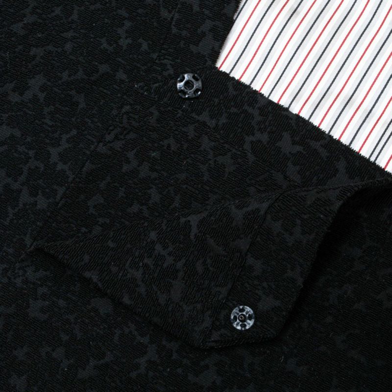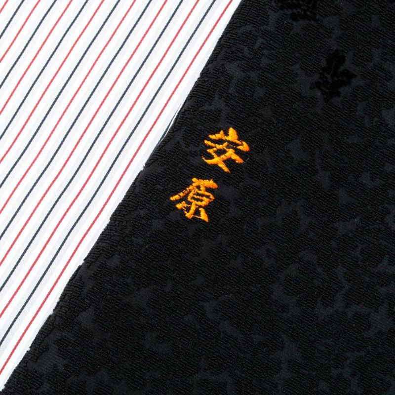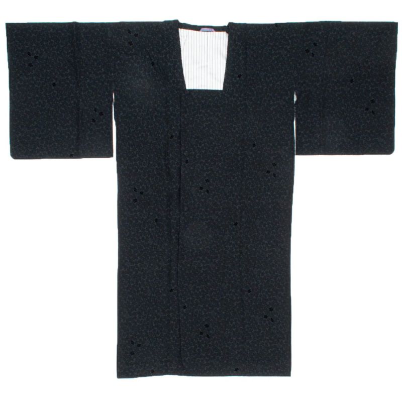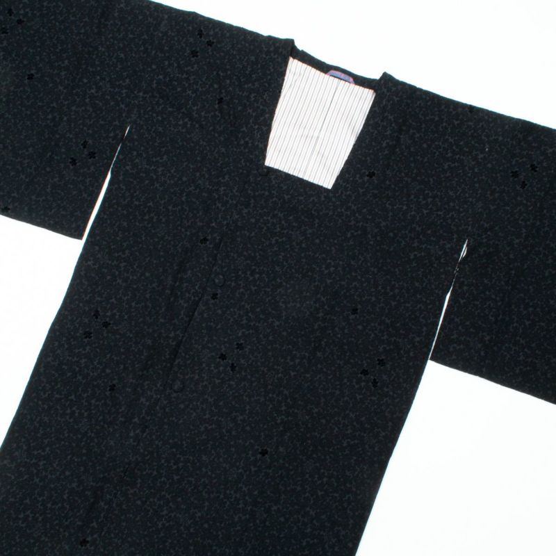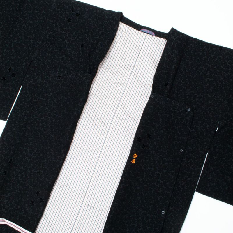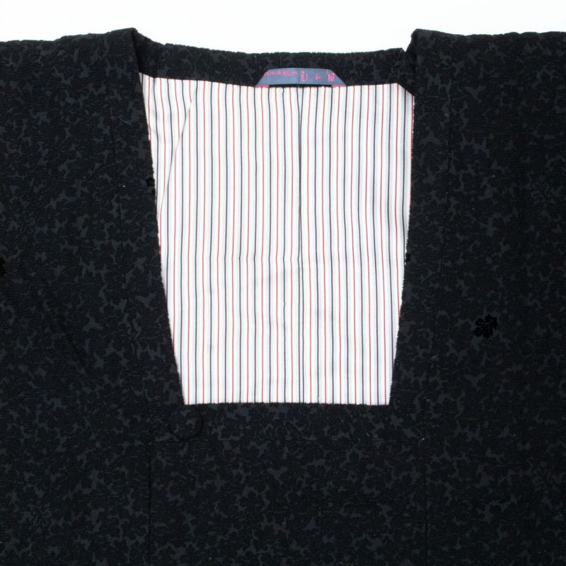 深みのあるブラックに、切りビロードで表現されたボタニカル文様が優雅に浮かび上がる道行きコートです。