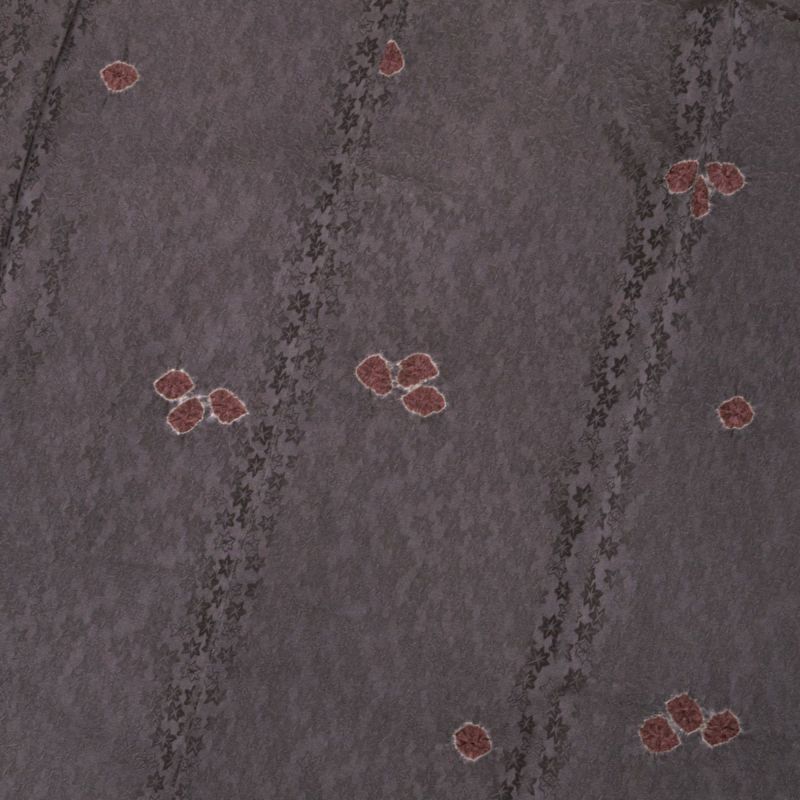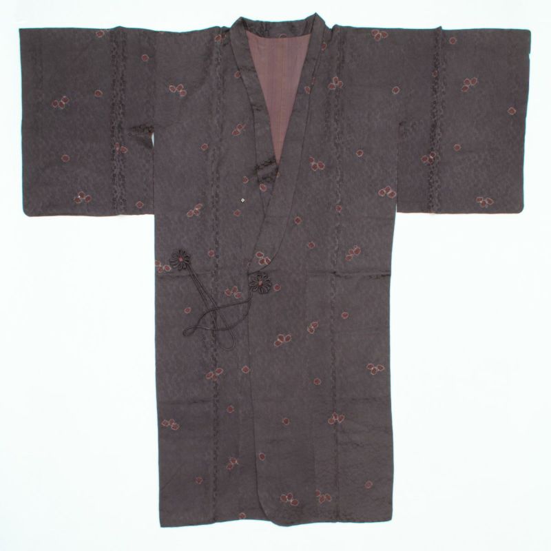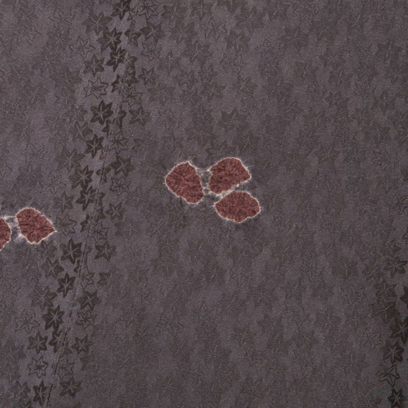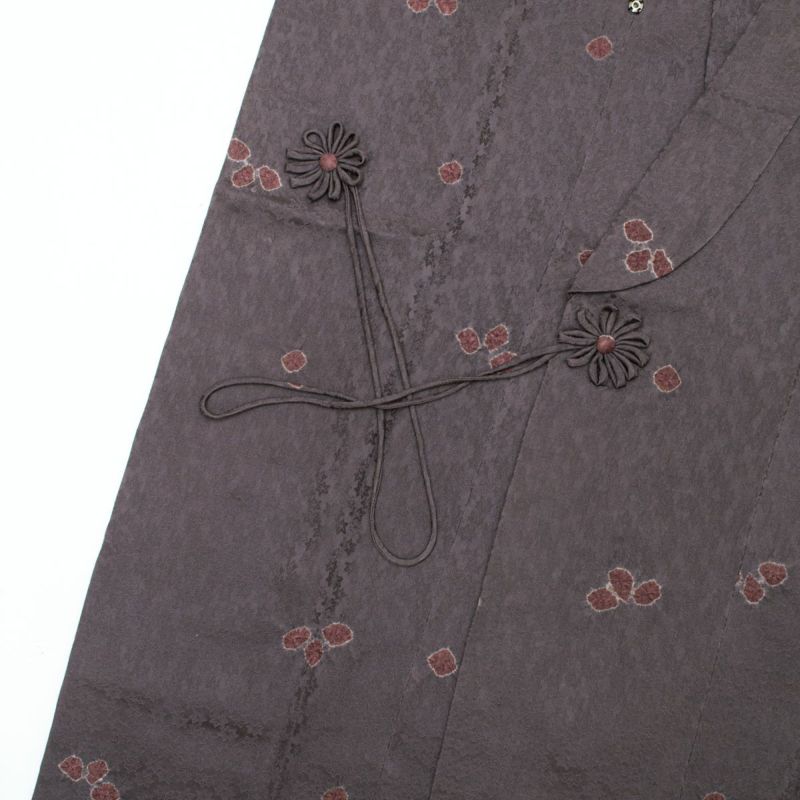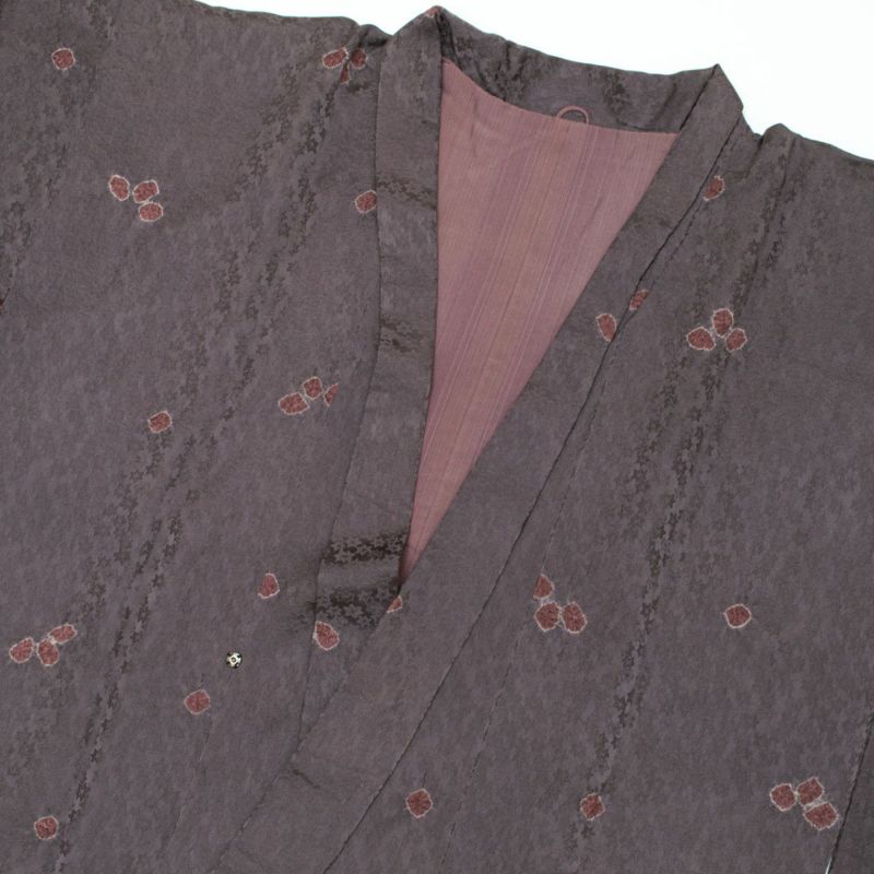 落ち着いた葡萄鼠(ぶどうねず)の深みある色合いに、柔らかな絞り染めの紫鳶(むらさきとび)の丸文が散りばめられた上品な道中着です。