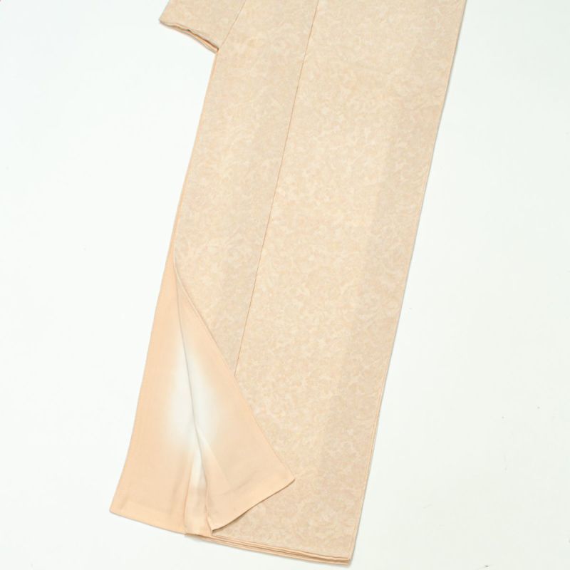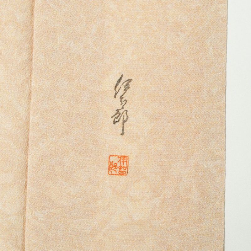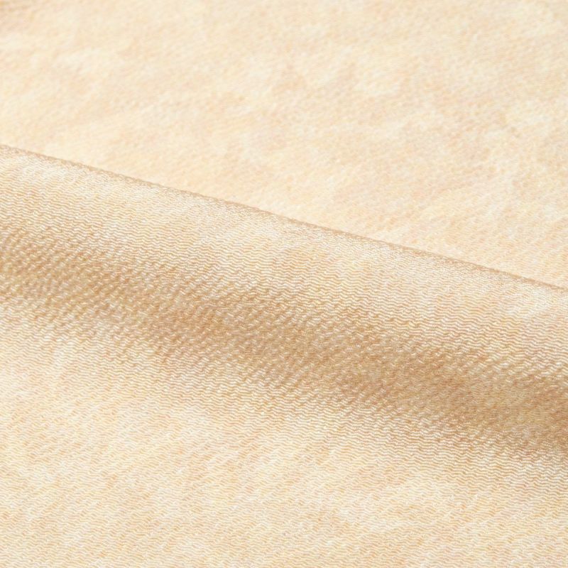 やや赤みを含んだ柔らかなベージュ地に、優しい濃淡が重なり、穏やかで上品な印象に仕上がっています。織の凹凸によって光の加減で表情が変わるのも、古代縮緬ならではの魅力です。