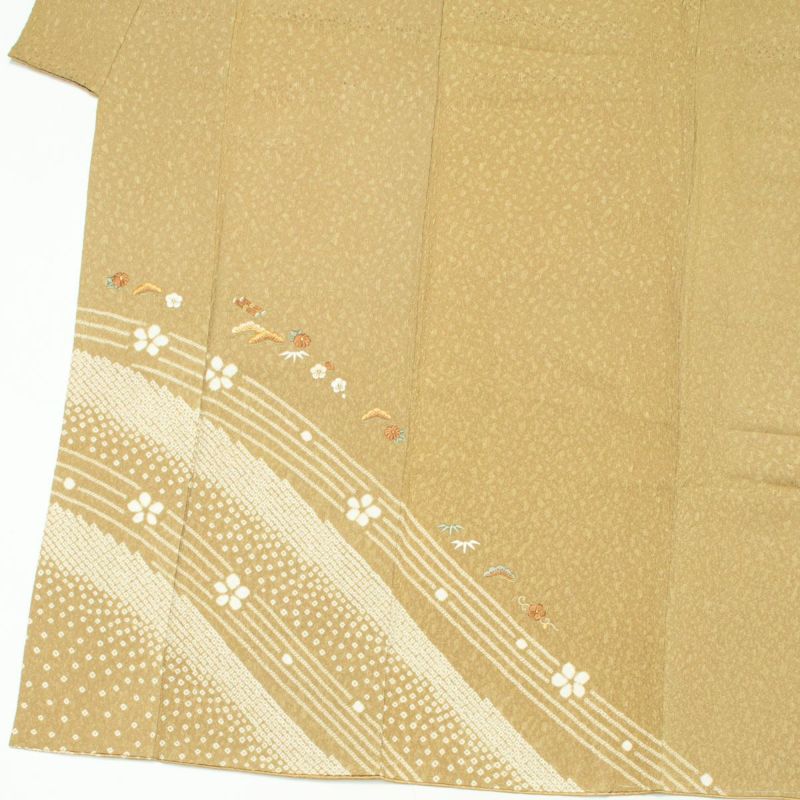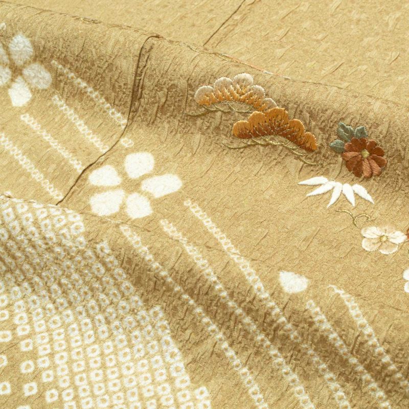 やわらかな光沢と立体感をたたえた、ふくれ織の紋意匠地に染めと刺繍を重ねた訪問着です。