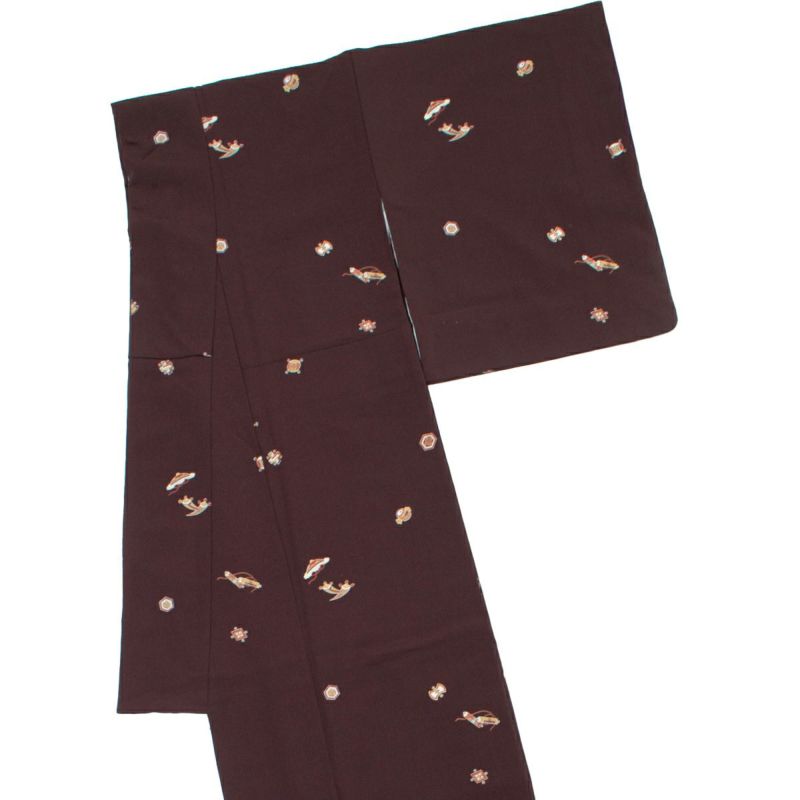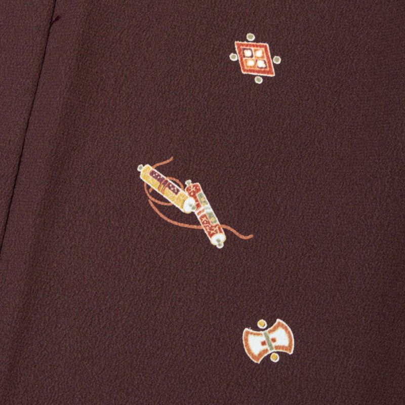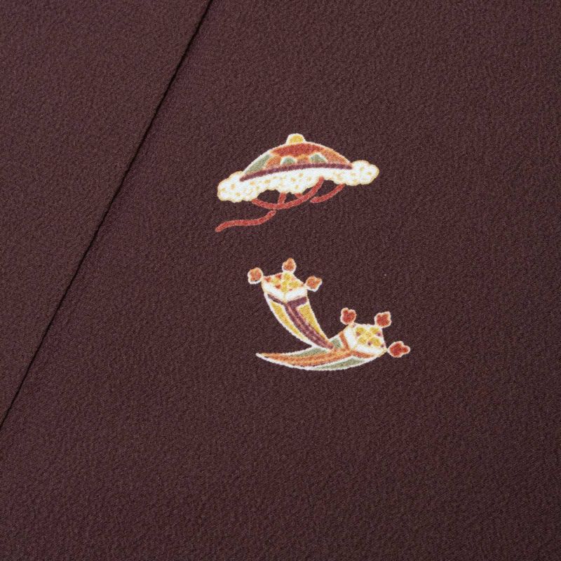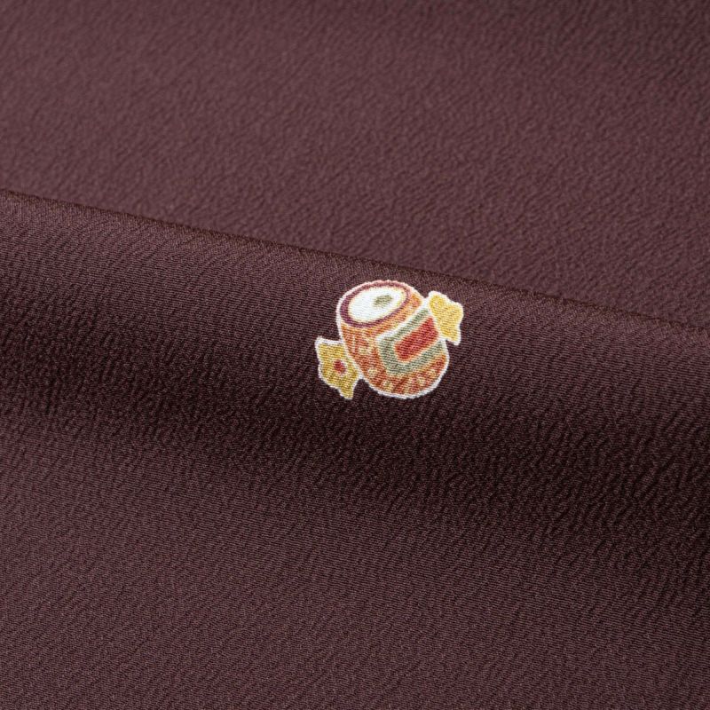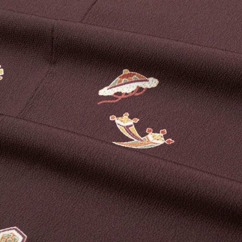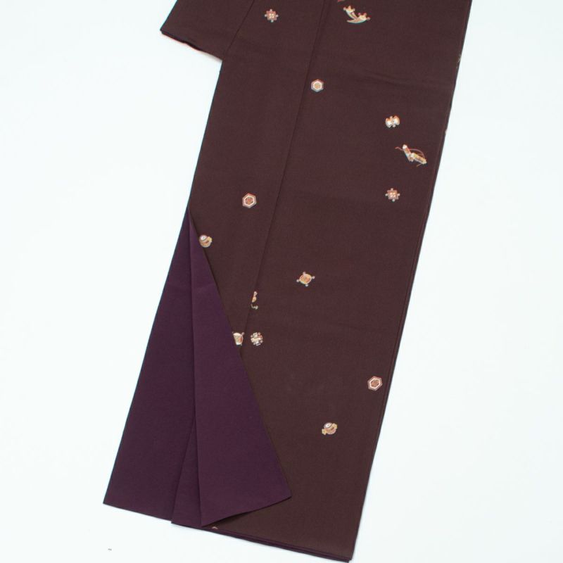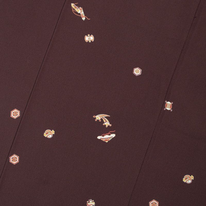 深みのある紫鳶(むらさきとび)色地に、上品な友禅調の「宝尽くし文」が飛び柄であしらわれた高級ポリエステルの小紋です。