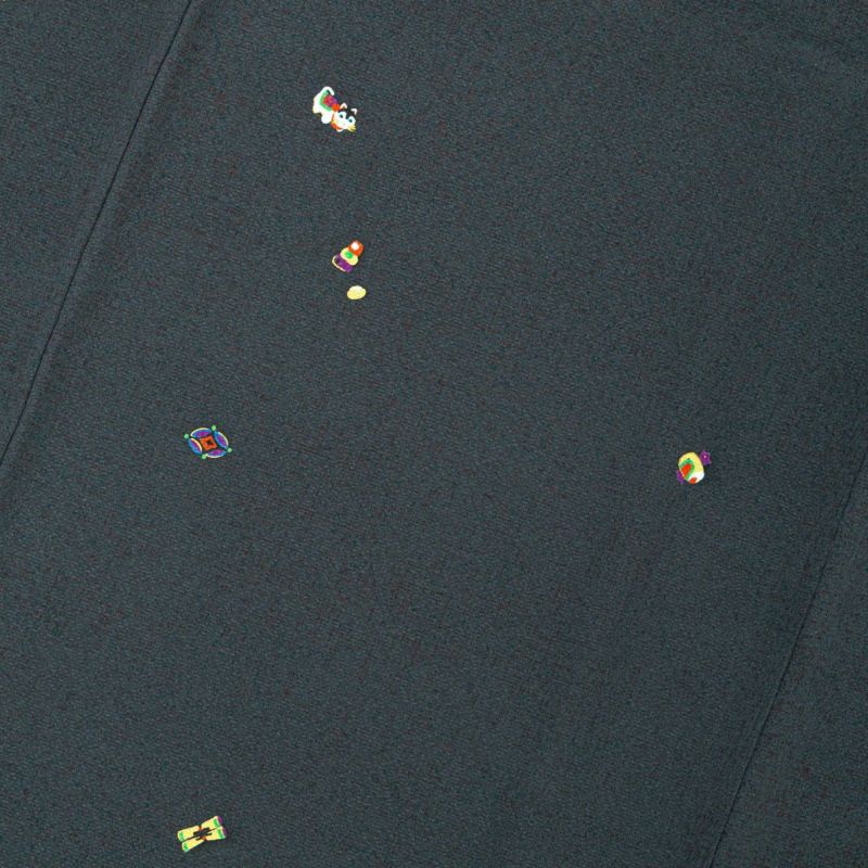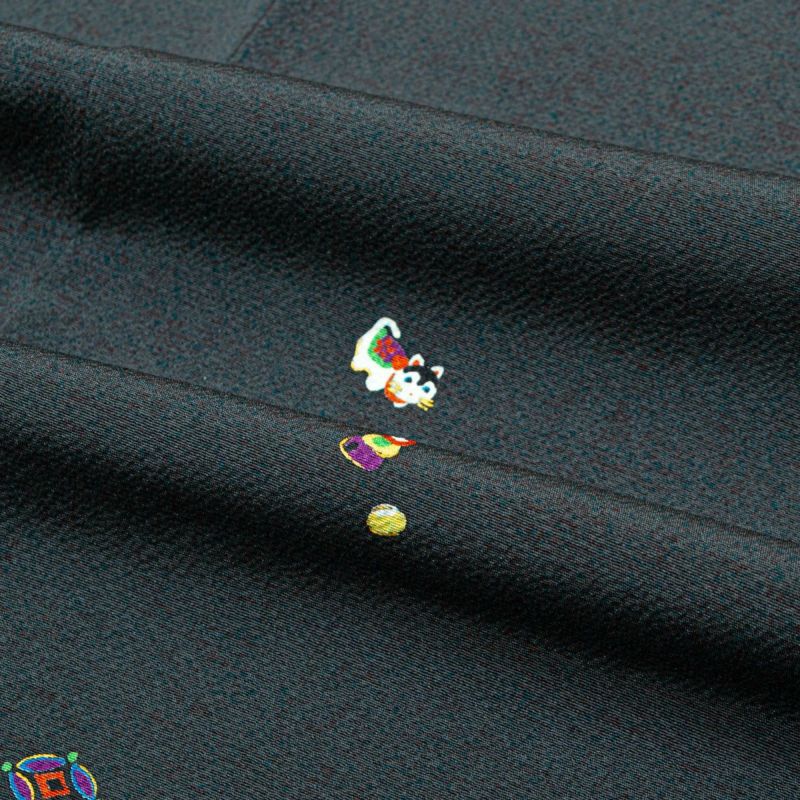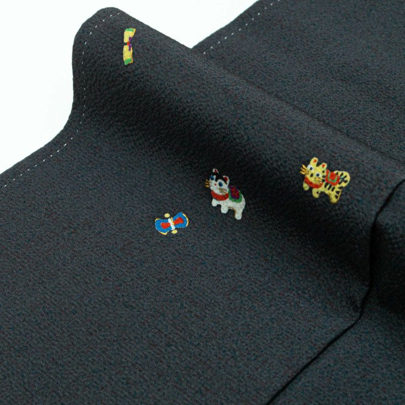 落ち着いたチャコールグレーの地に、手描き友禅で可愛らしい張り子の玩具を散らした、愛らしくも品のある小紋です。