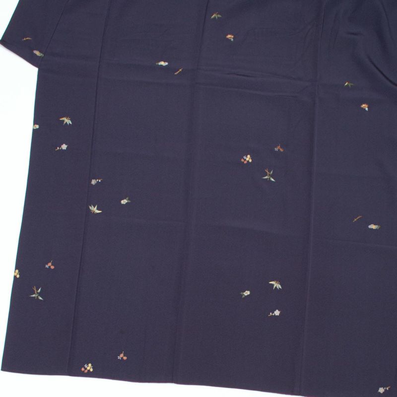 深みのある濃鼠(こいねず)色の地に、四季の草花や縁起物を繊細な手刺繍で散りばめた、上質な飛び柄小紋です。