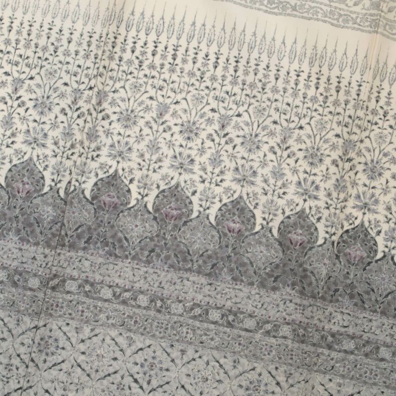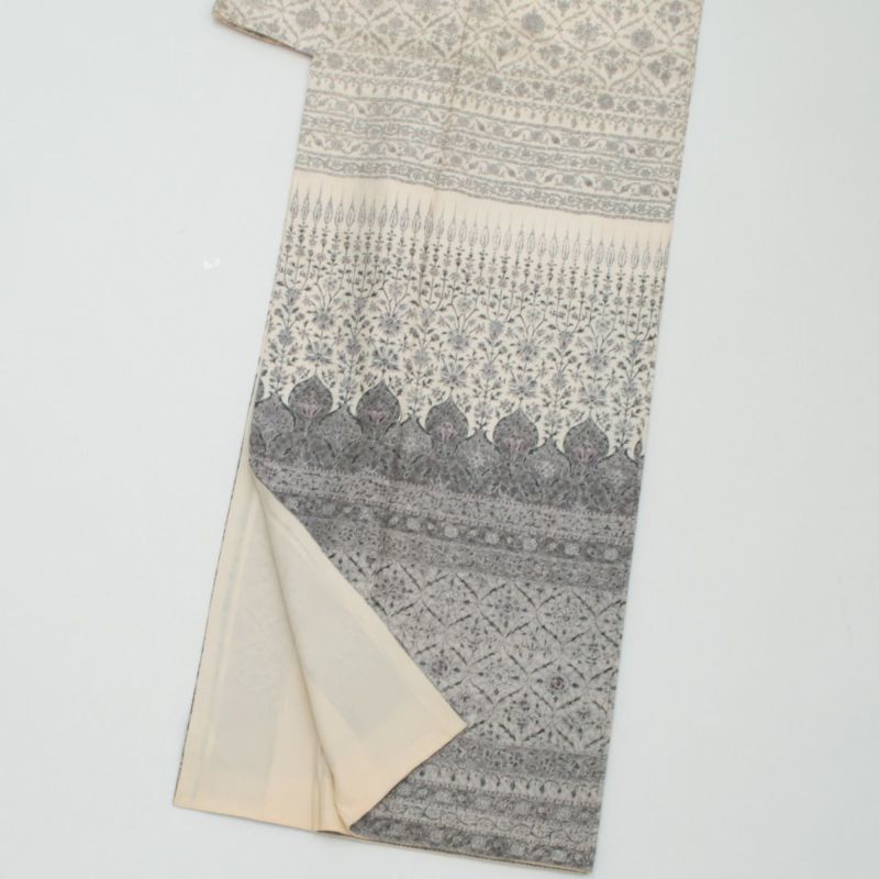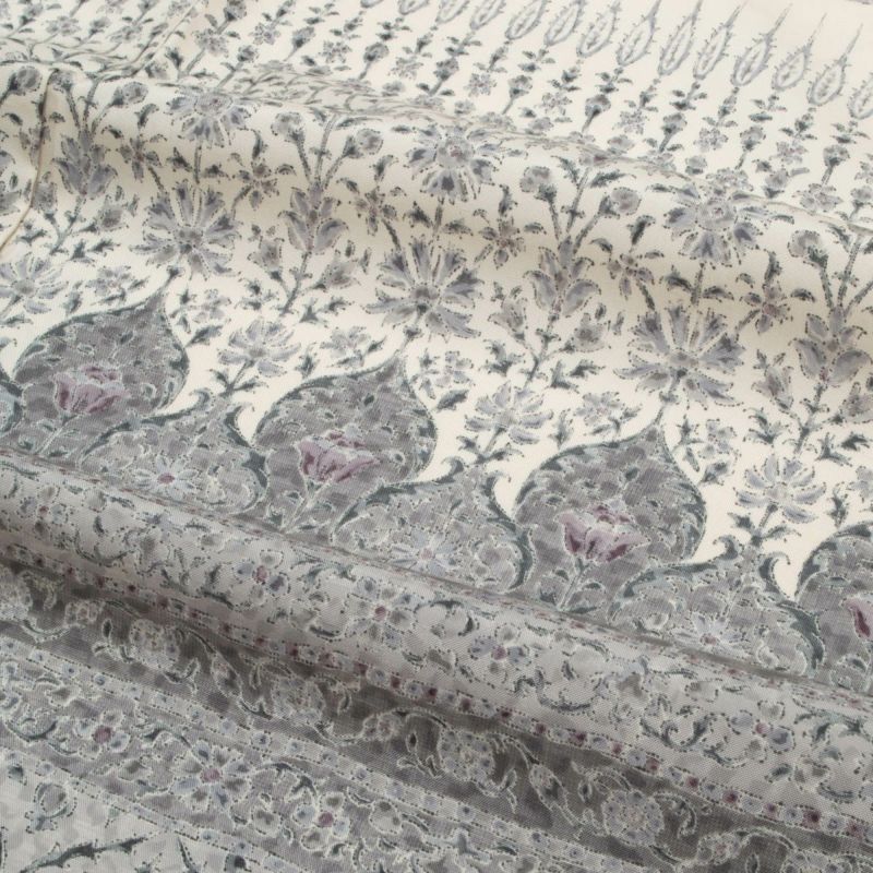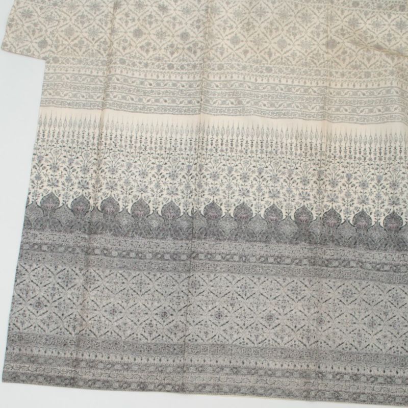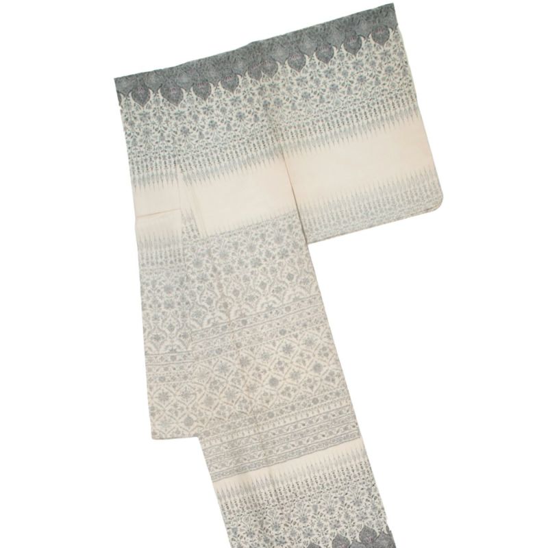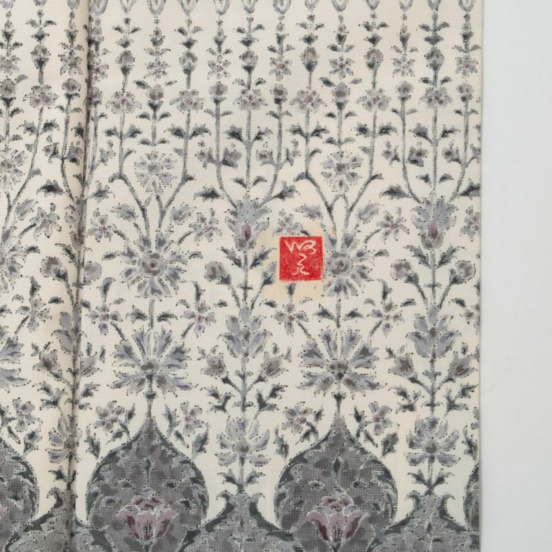 白みを帯びた柔らかなオフホワイト地に、落ち着いたグレーで江戸更紗のような繊細な模様が染め出されています。