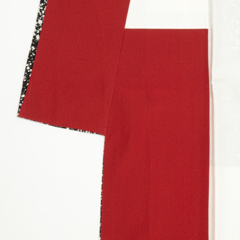 裏地には赤を配しており、裾さばきにさりげないアクセントを添えます。