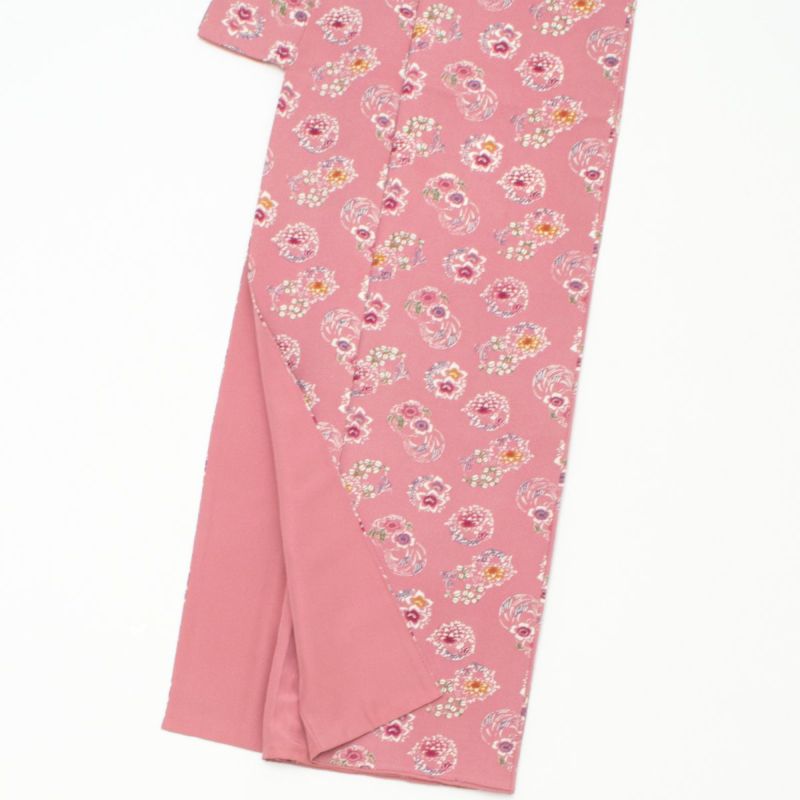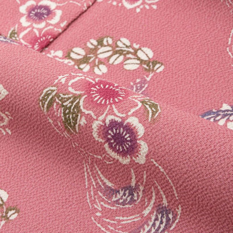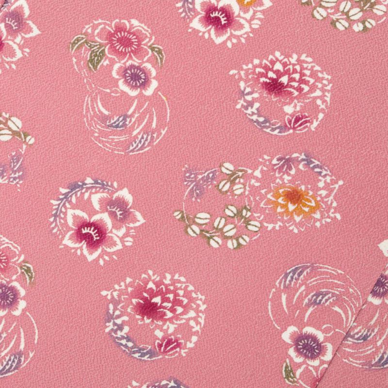 温かみのある桃花色(ももはないろ)を地色に、季節の花々や葉をモチーフにした植物の丸文様がリズミカルに配されています。