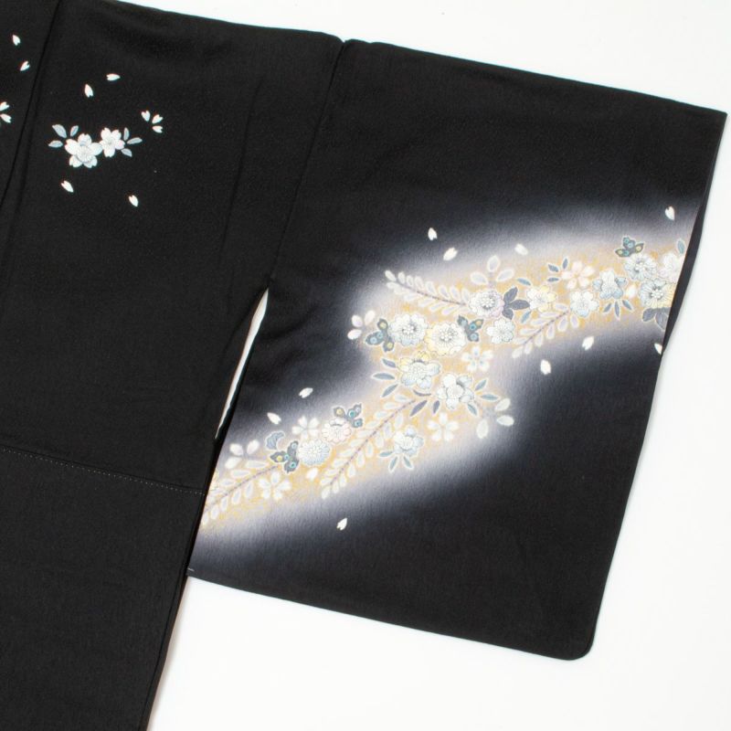 気品ある黒地に、優雅な流れを描く曲線文様と、華やかに咲き誇る桜・辻が花文様があしらわれた訪問着です。