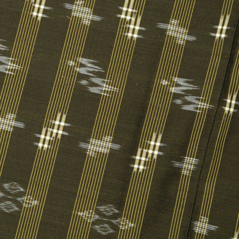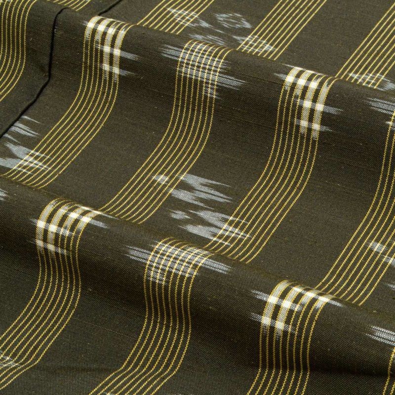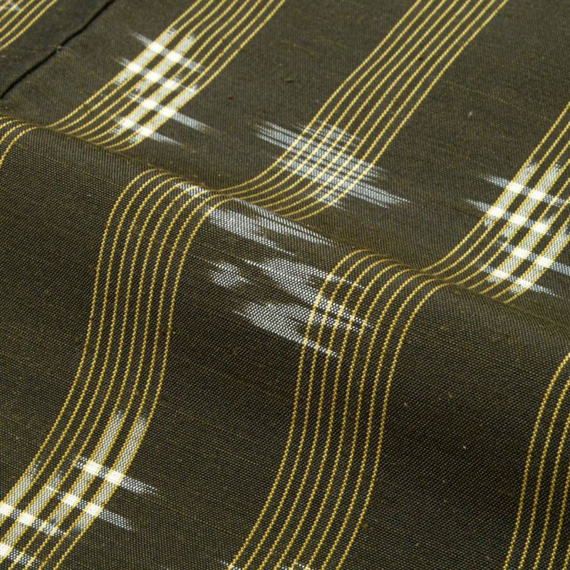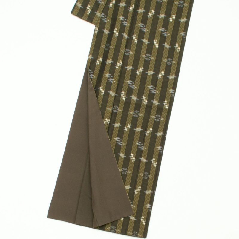 深みのある千歳茶を基調に、黄色と白の絣が織りなす縞柄が美しい、青山みとも誂えの紬です。