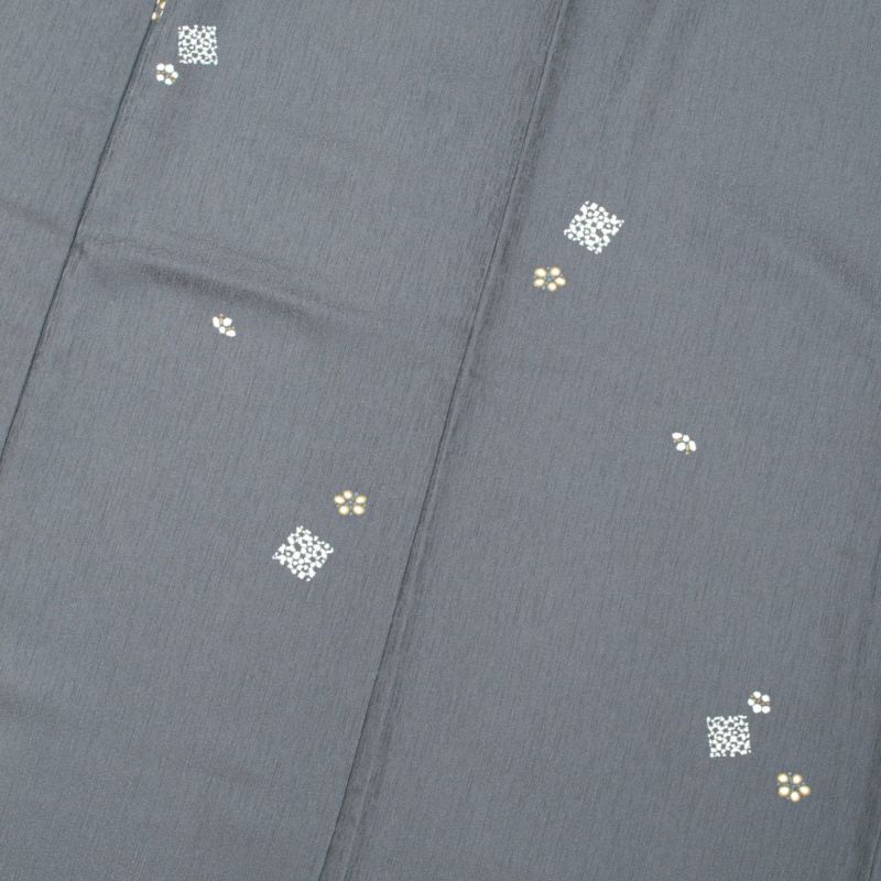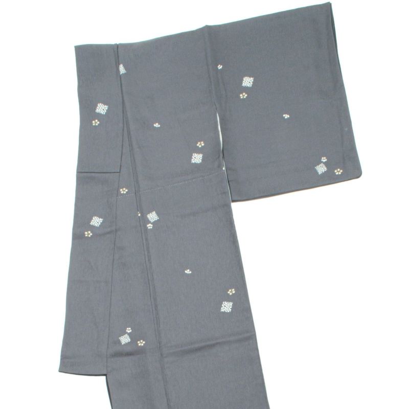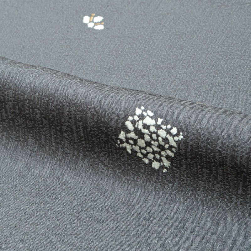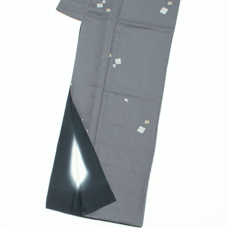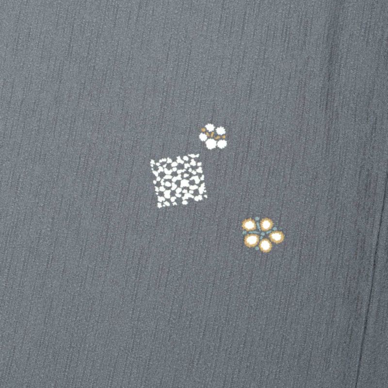 ダークグレーの地に、四角文と梅鉢文を飛び柄で配した上品な小紋です。