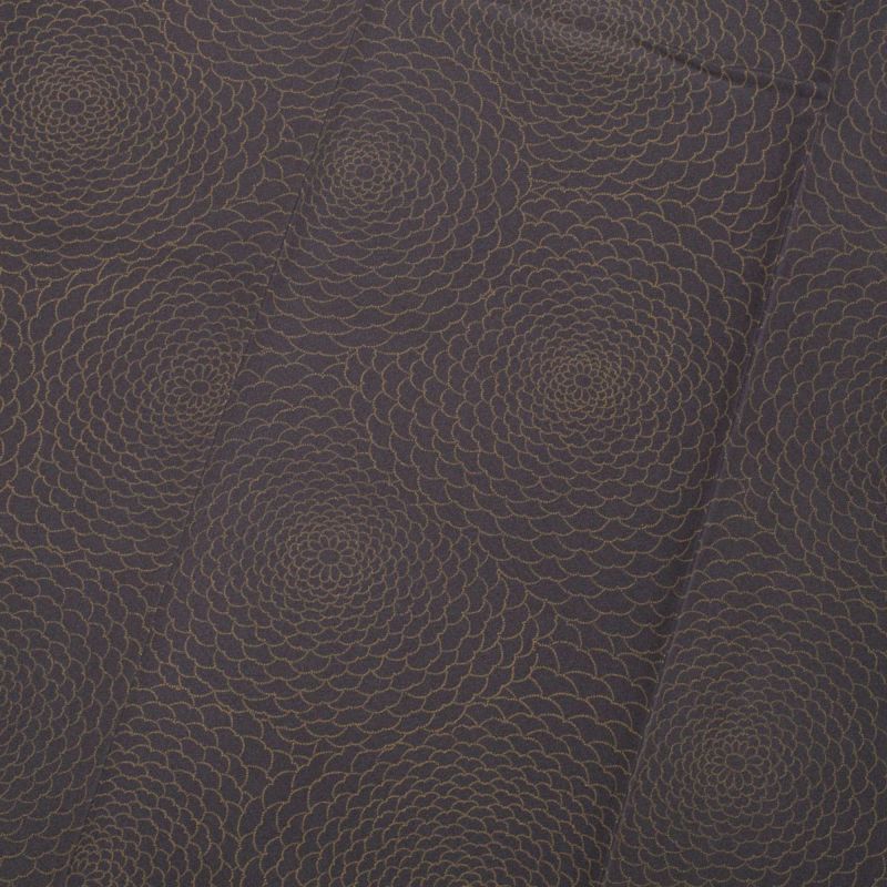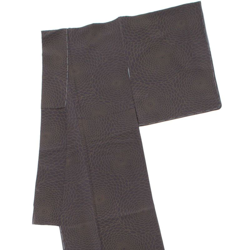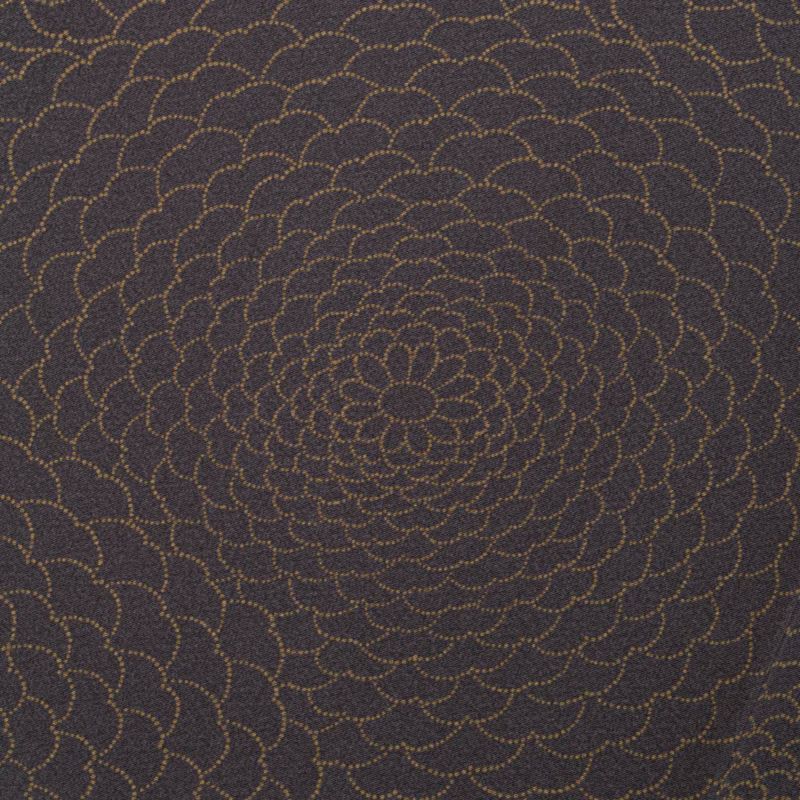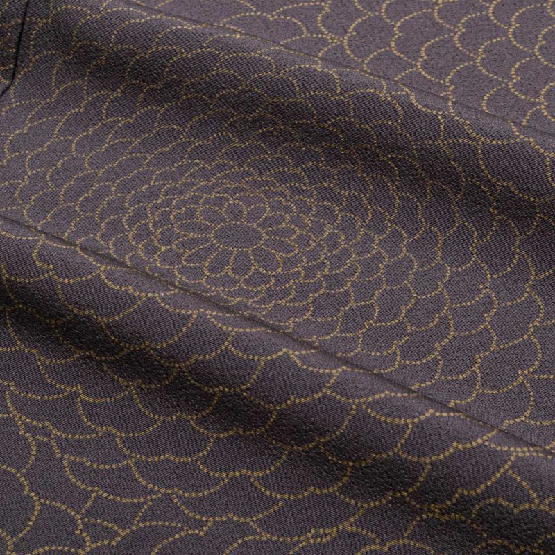 黒鳶(くろとび)のシックな地色に、菊花尽くし文を友禅であしらった、未使用・仕付け糸付きの小紋です。