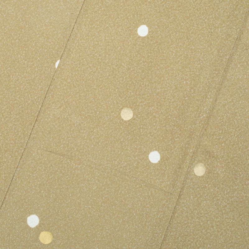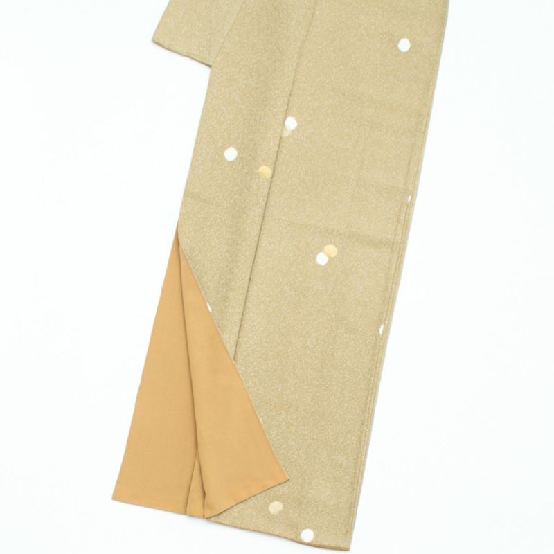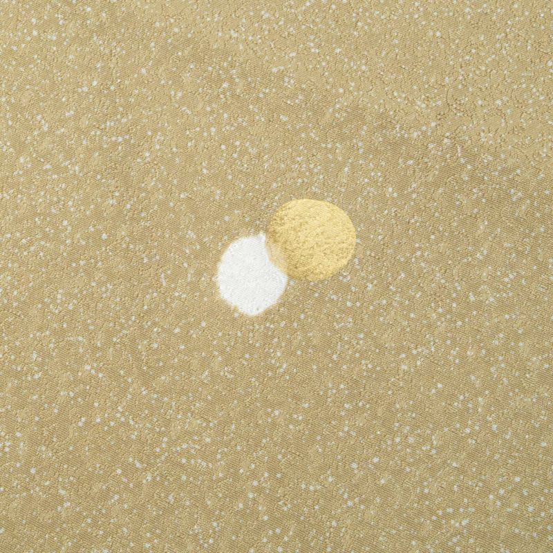 たたき染め風の細かな地紋に、絞り染めによる白とゴールドの丸文がリズミカルに散りばめられ、控えめながら洒落感のある雰囲気に仕上がっています。