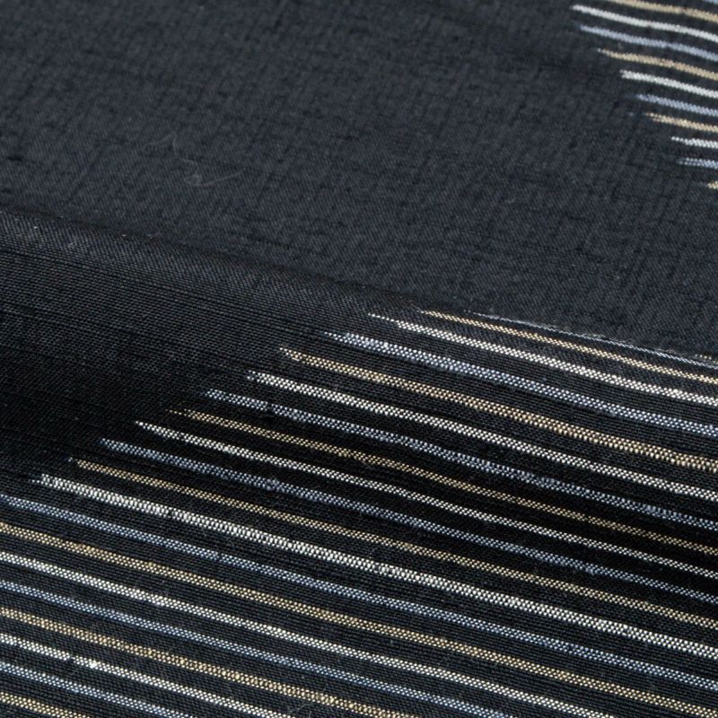 黒地をベースに、白・灰青・黄色の細やかなボーダー柄を組み合わせ、動きのある独特のラインが表情豊かに映えます。