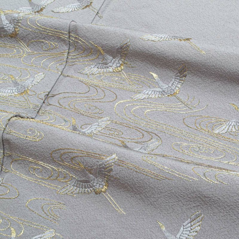柔らかなグレーの地色は、光の加減でほんのりと艶を帯び、刺繍の金糸・銀糸が上品に浮かび上がります。