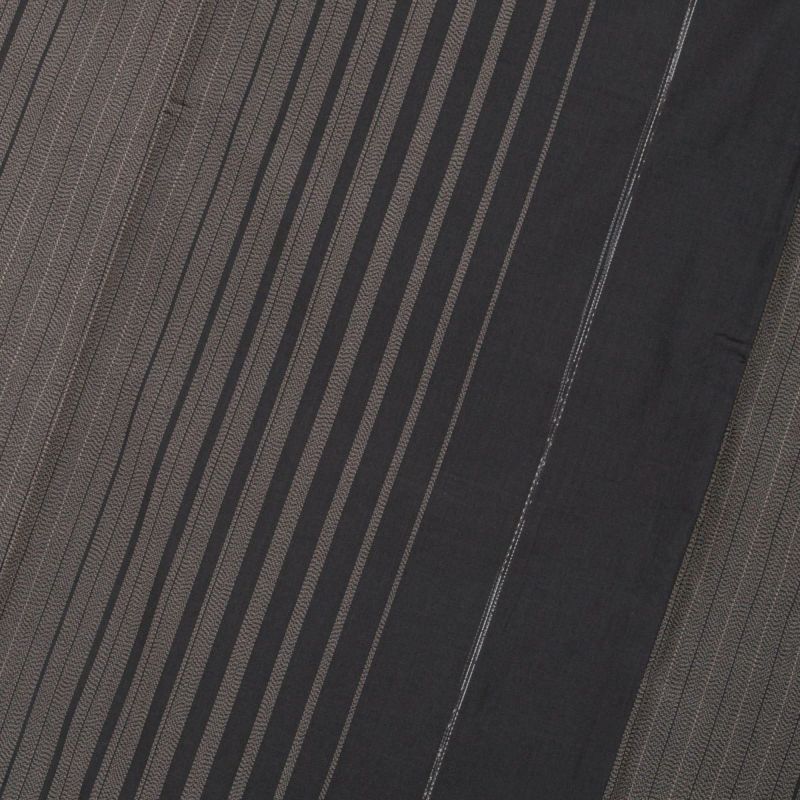 本場大島紬ならではの深みある“泥染め”の黒地に、すっきりとした縞文様を配した一枚です。