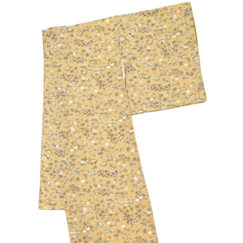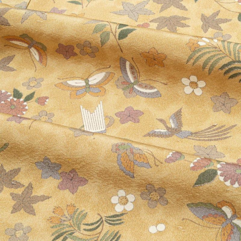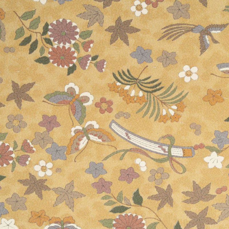 横段状に広がる楽器や植物文様がリズミカルで、動きのある意匠ながら、落ち着いた色調でまとめられているため、装いに取り入れやすいデザインです。