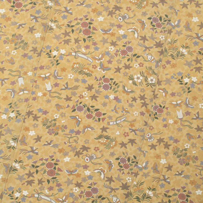 華やかな和楽器文様や鳳凰、可憐な胡蝶が舞う、友禅染めの小紋です。
