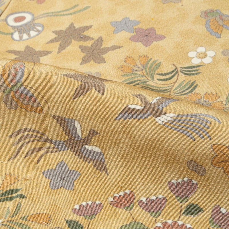 榛色(はしばみいろ)の柔らかな地色に、四季の花々や古典意匠を細やかに描き、上品な可愛らしさと優美さが調和した一枚です。