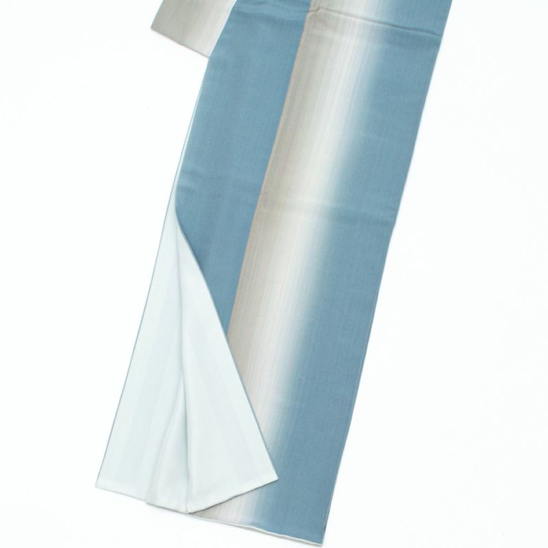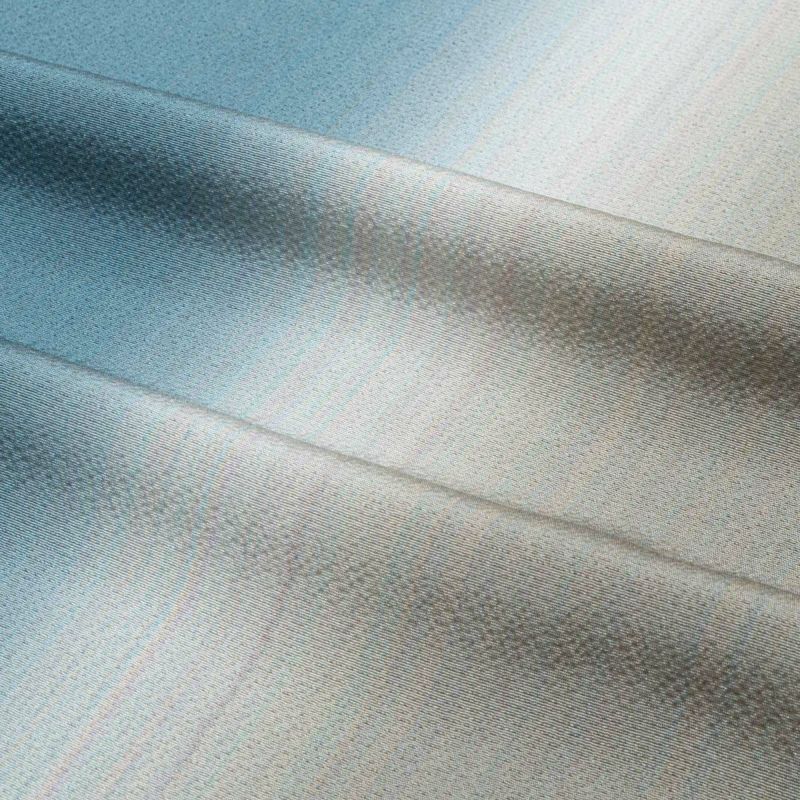 淡い水浅葱から柳茶へと溶け込むように移ろう、美しい縞暈しが印象的な小紋です。