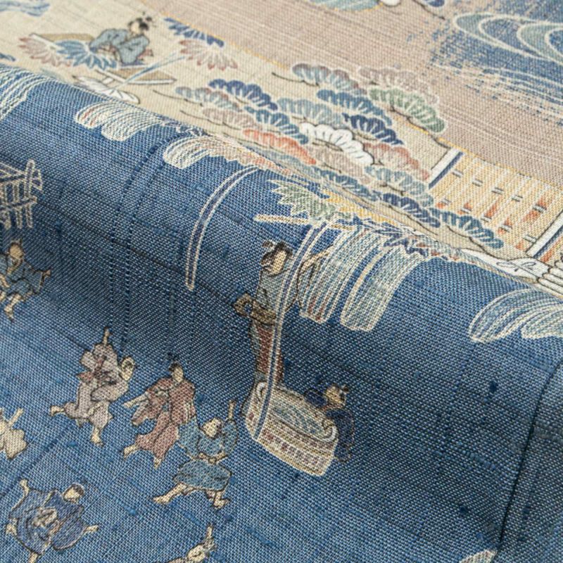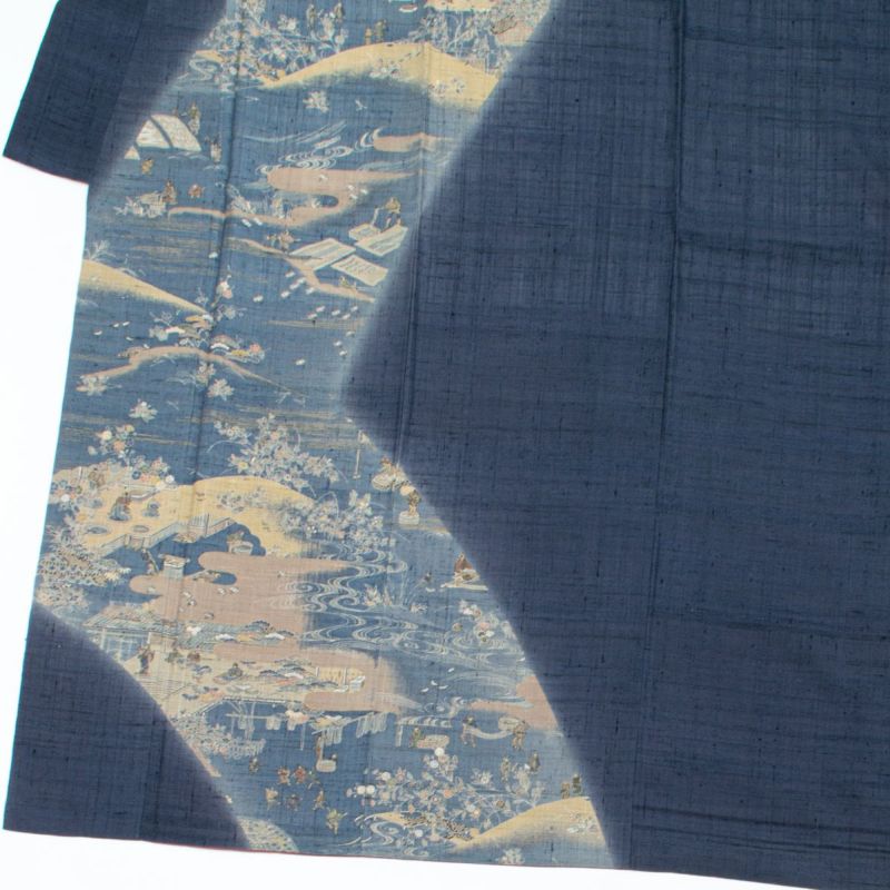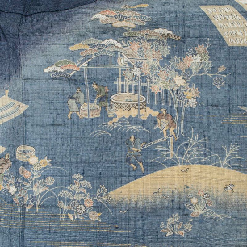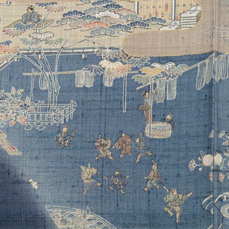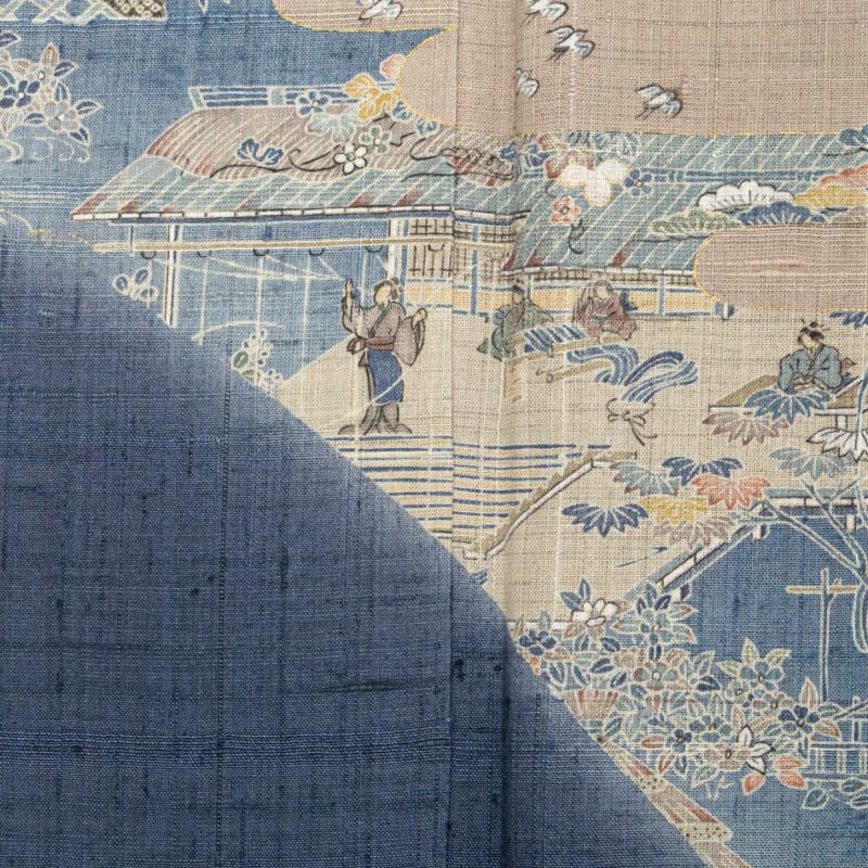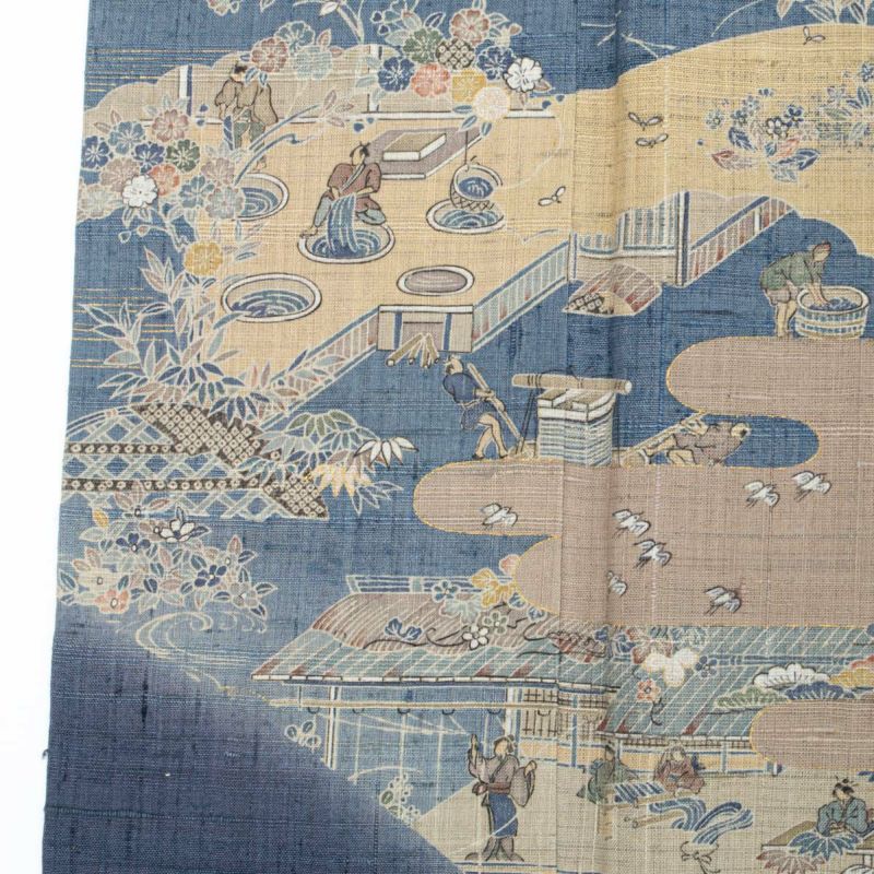 経年を思わせる落ち着いた藍鼠の地色に、職人たちが糸を紡ぎ、布を干し、染める様子が細やかに表現されています。