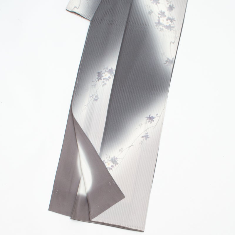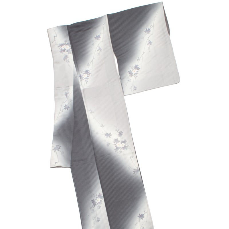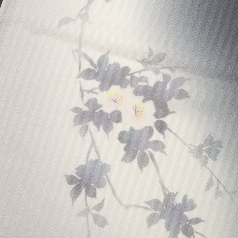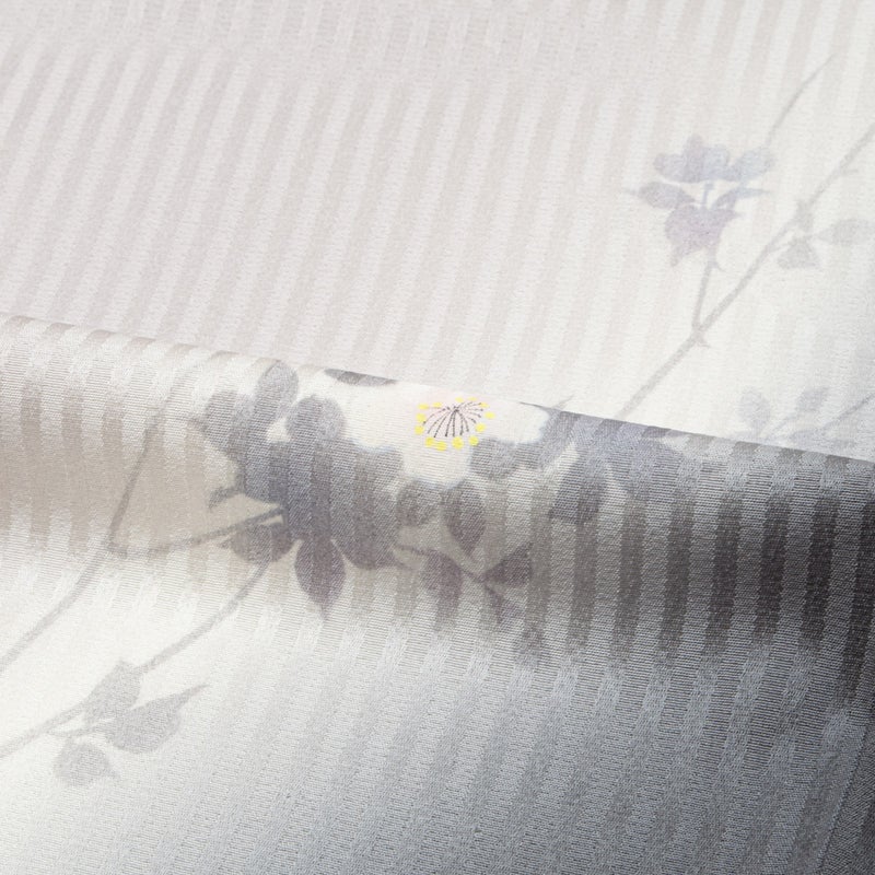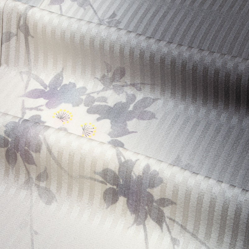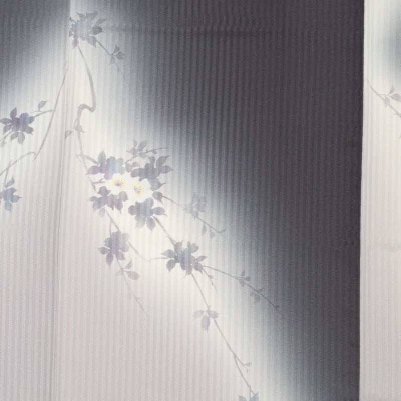 縦に流れる地紋の上に、淡く浮かび上がる桜の花のシルエットが、風に揺れるように軽やかな気配を添えています。