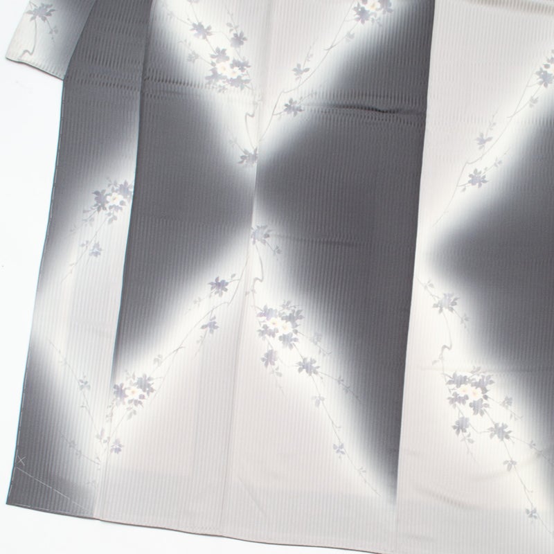 【美品】小紋 友禅 暈し シルエット 桜の花の図 消炭色 白 灰青 正絹 袷です。