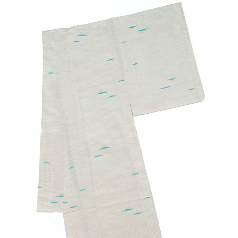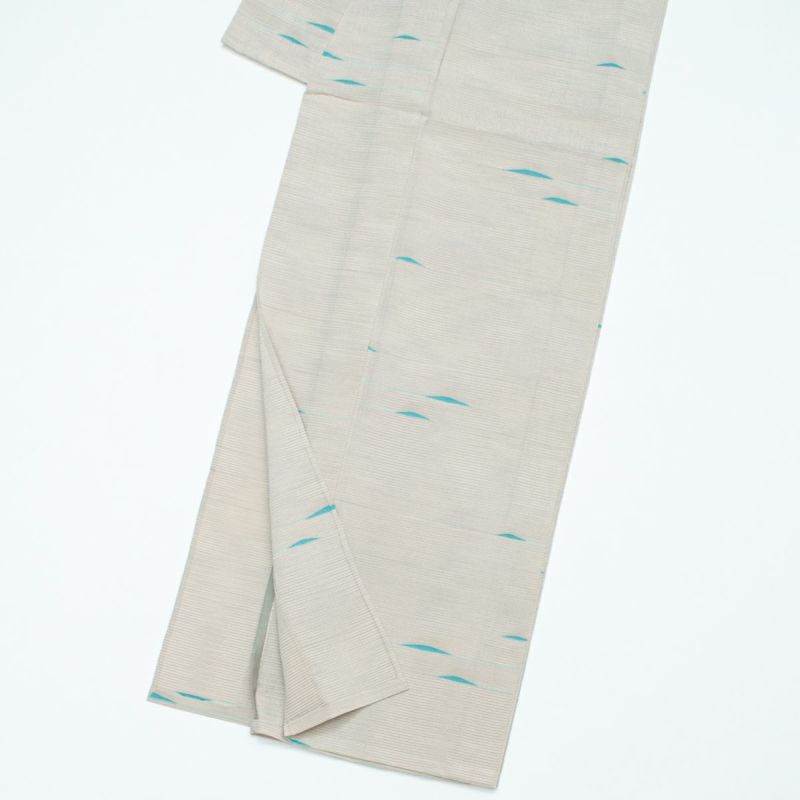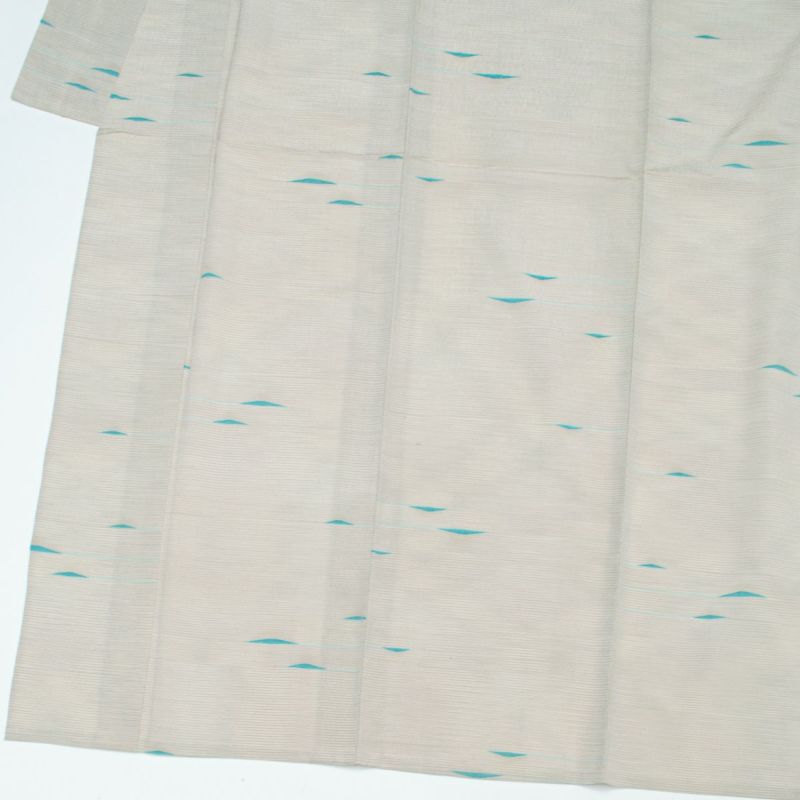 上品なオフホワイト地に、青磁色のアクセントが軽やかに映える塩沢御召の単衣小紋です。