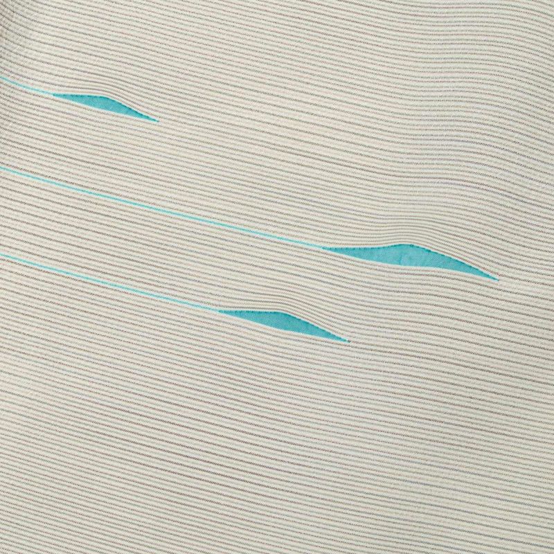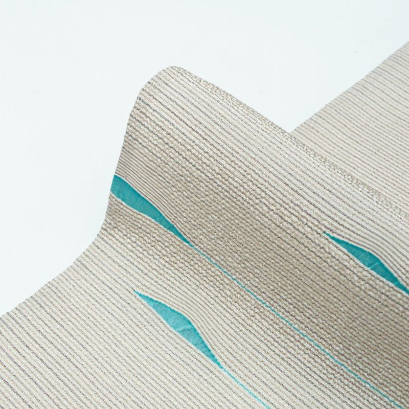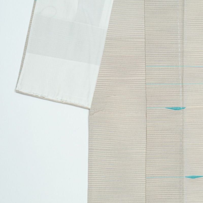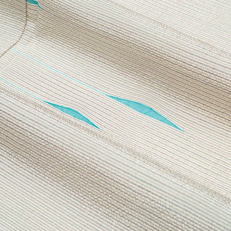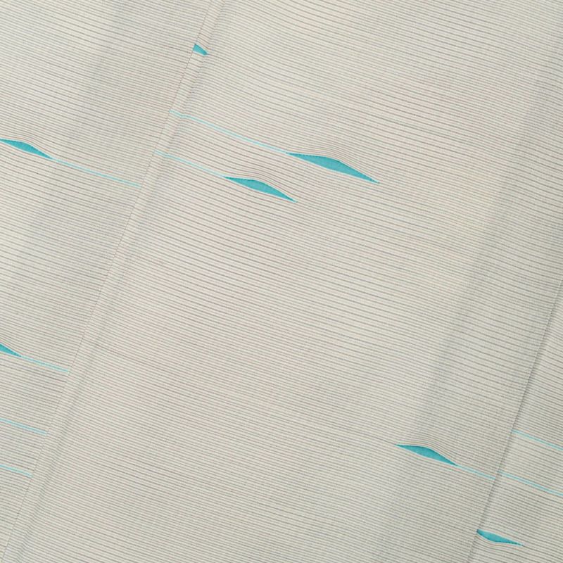 細やかなボーダー柄の地紋に、シャープな青磁色の模様が流れるように配され、静かに個性を主張する一着となっています。