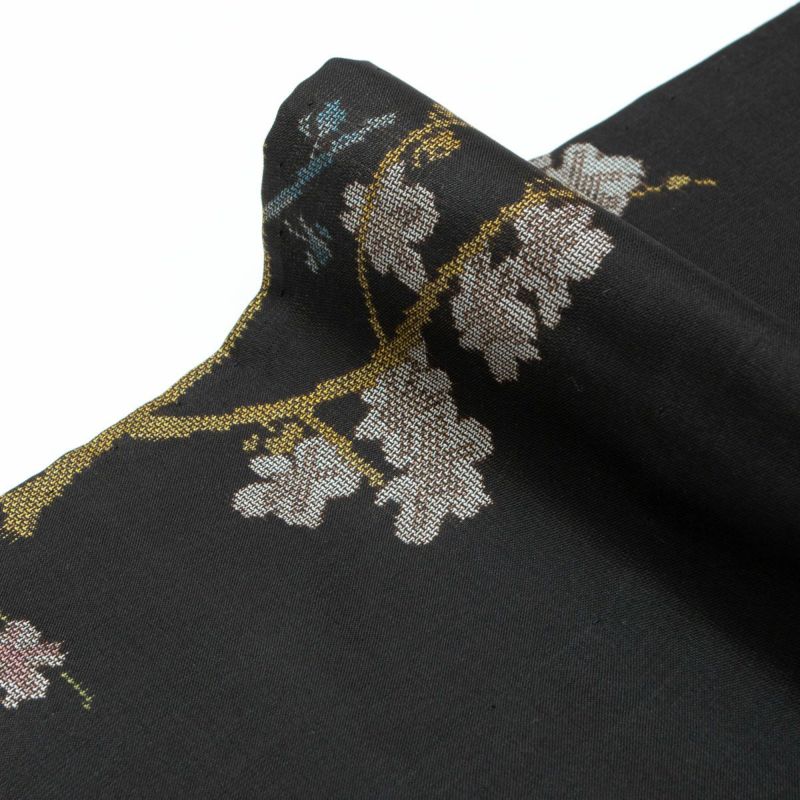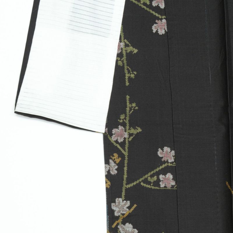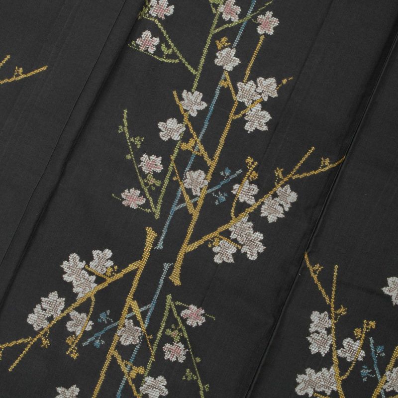 深みのある黒地に、繊細な桜文様が絣で表現され、品格と華やかさを兼ね備えた意匠となっております。