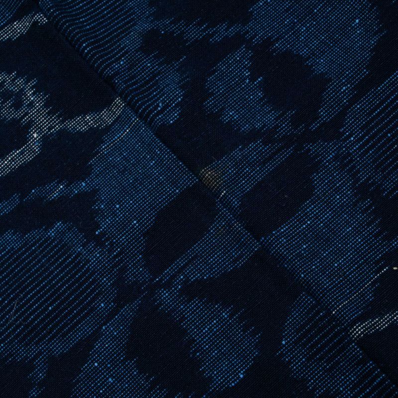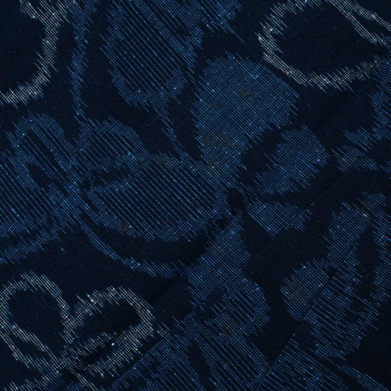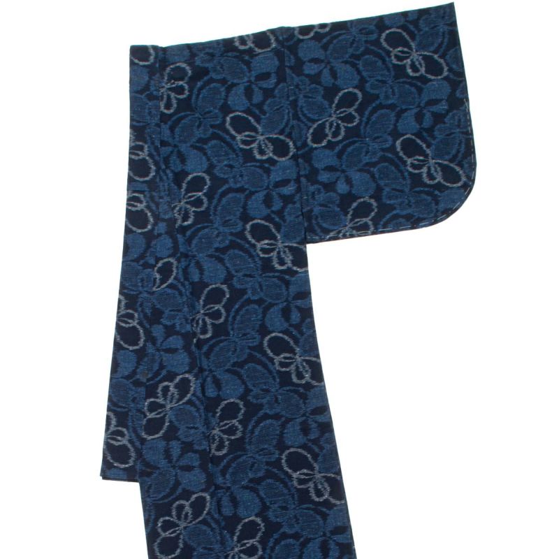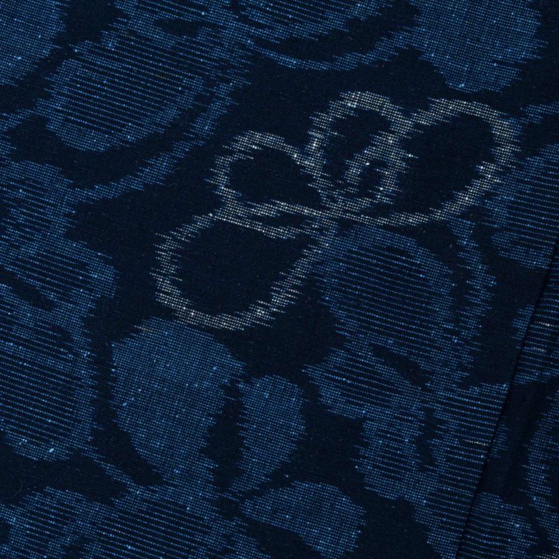 藍を基調とした深みのある地に、花を模した蝶のような文様がふわりと舞うように配置されています。