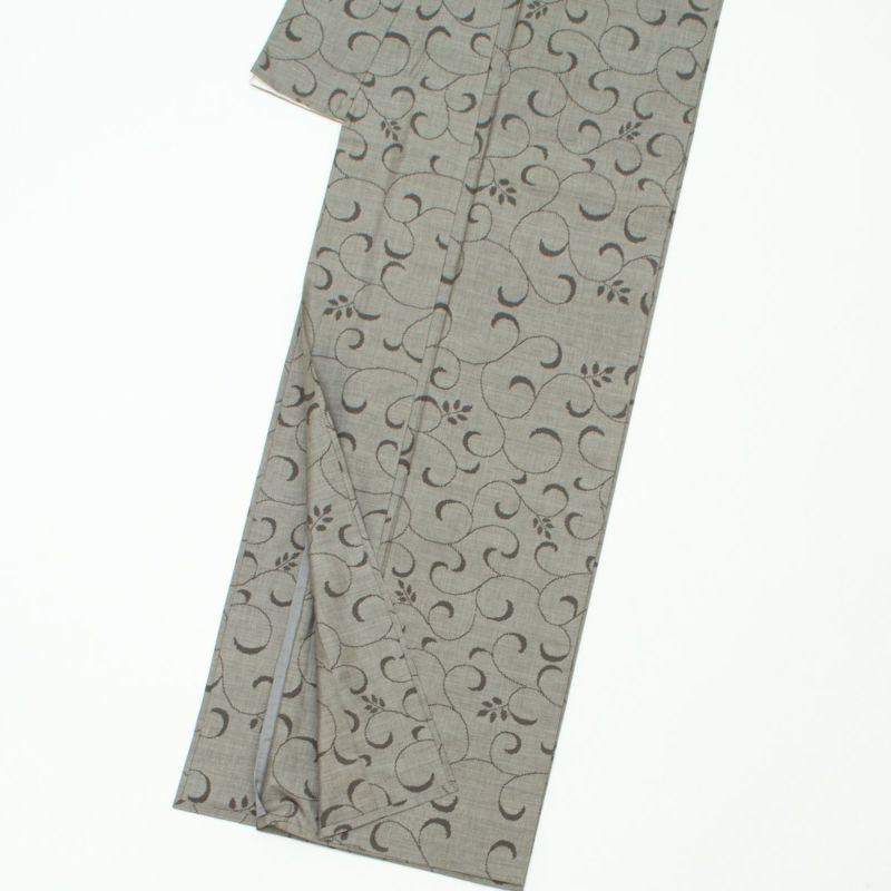 渋みのあるチャコールグレー地に、唐草文様が絣で織り出された単衣仕立ての大島紬です。