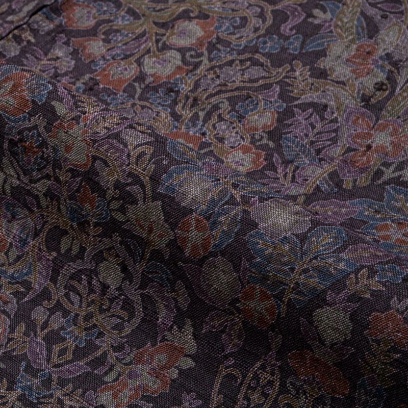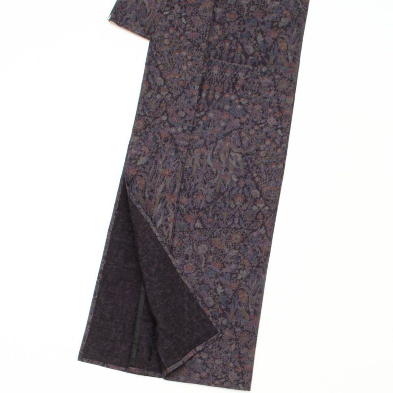 草花や唐草をモチーフとした更紗模様は、古典的でありながらどこかエキゾチックな印象を醸し、落ち着いた色合いに調和して、大人の装いにぴったりの一着となっています。