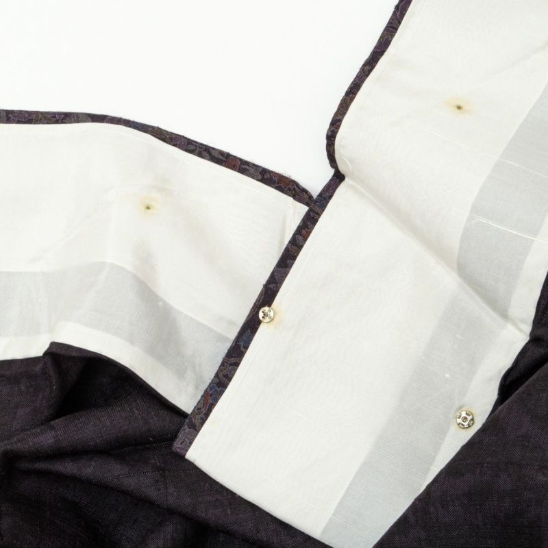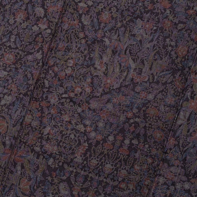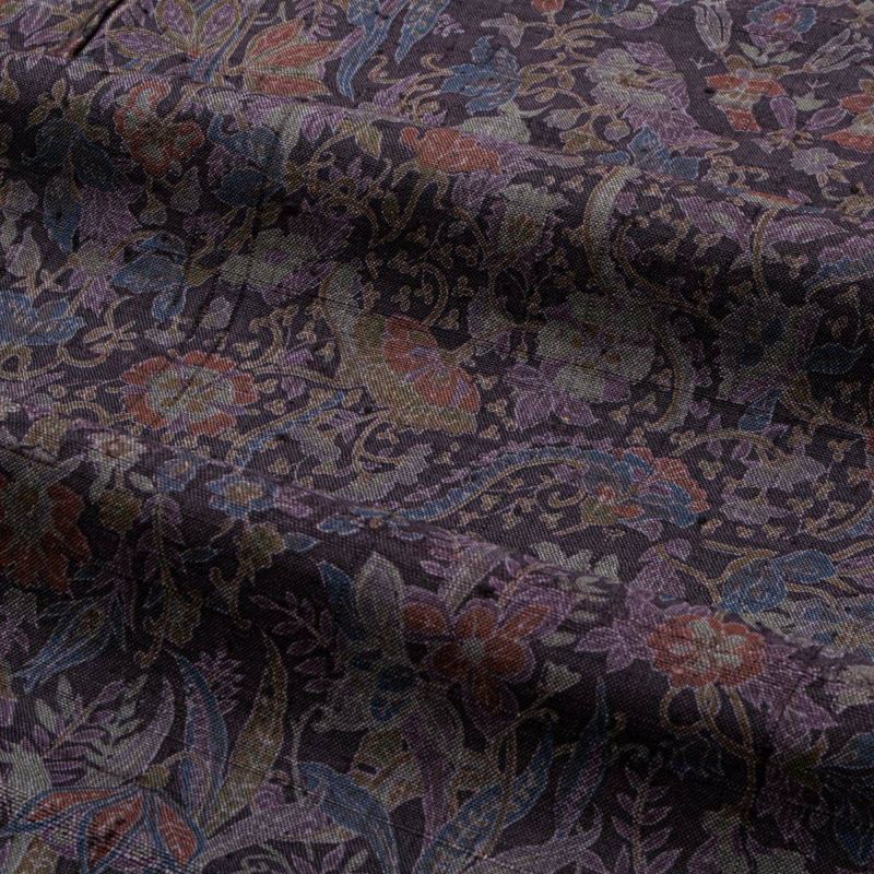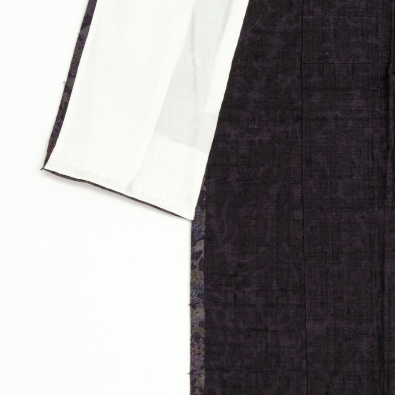 深みのある烏羽色(からすばいろ)を基調とした地に、繊細な江戸更紗の技法で表現されたボタニカル文様が一面に広がる単衣の紬です。