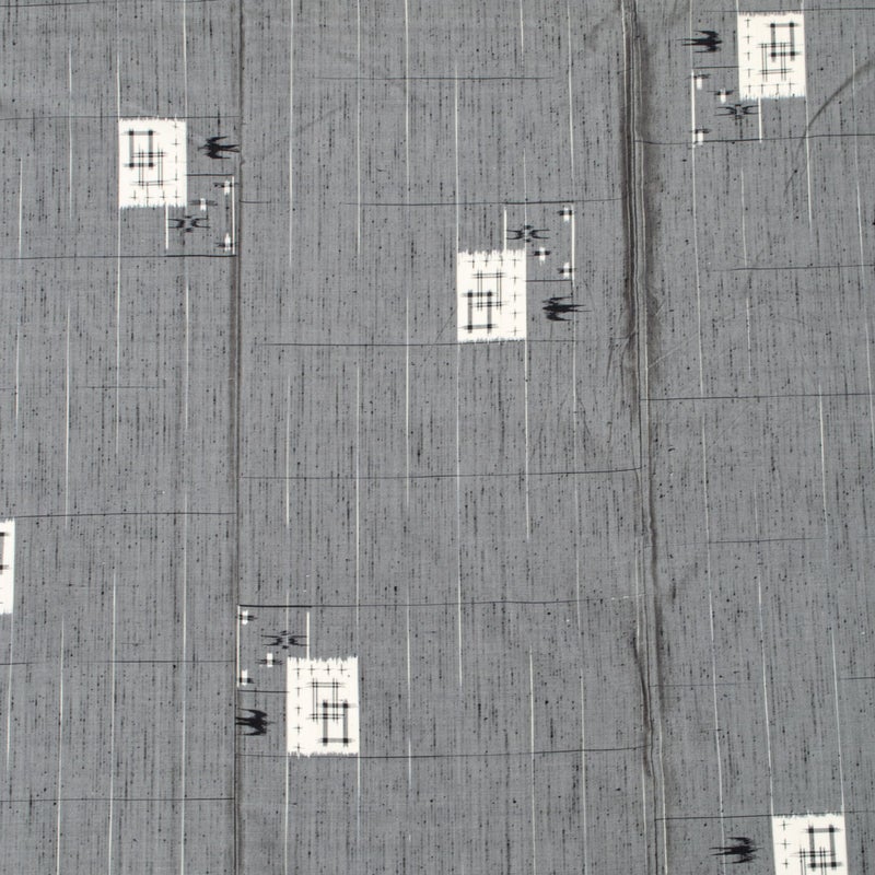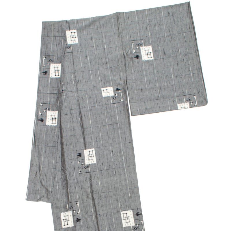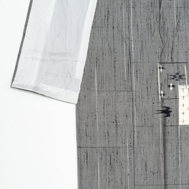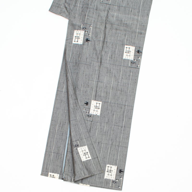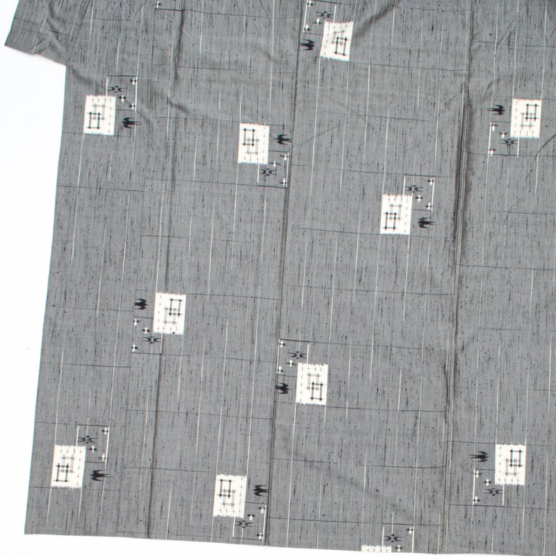 落ち着いたグレーの地に、琉球絣調の素朴な文様を散らした、味わい深い単衣の紬です。
