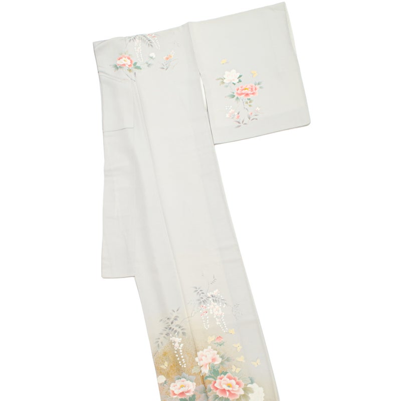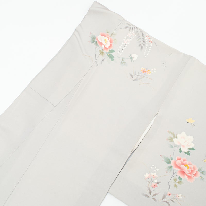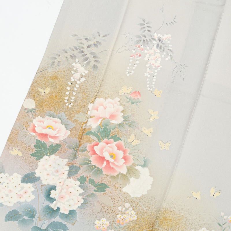 牡丹や藤、可憐な小花が軽やかに配され、淡い色彩の重なりが上品な奥行きを生み出します。