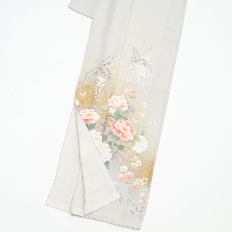 やわらかな淡いグレーの地に、金彩の霞をまといながら四季の花々が優しく咲き広がる、松井青々による訪問着です。