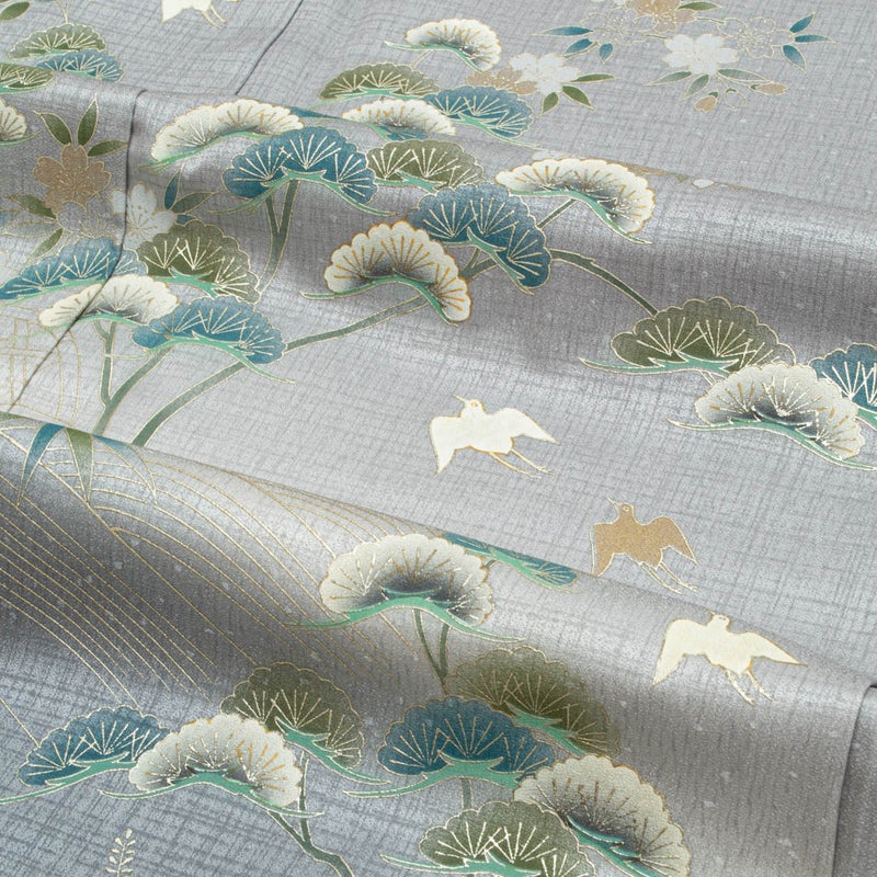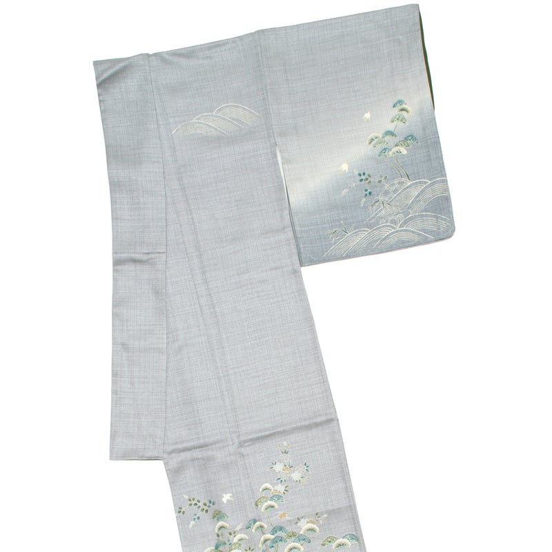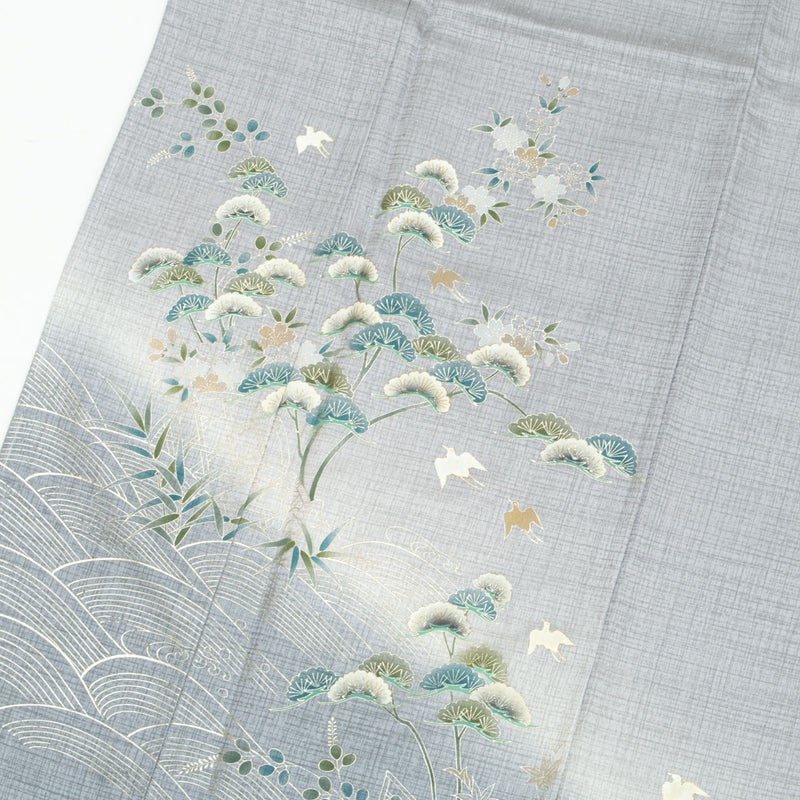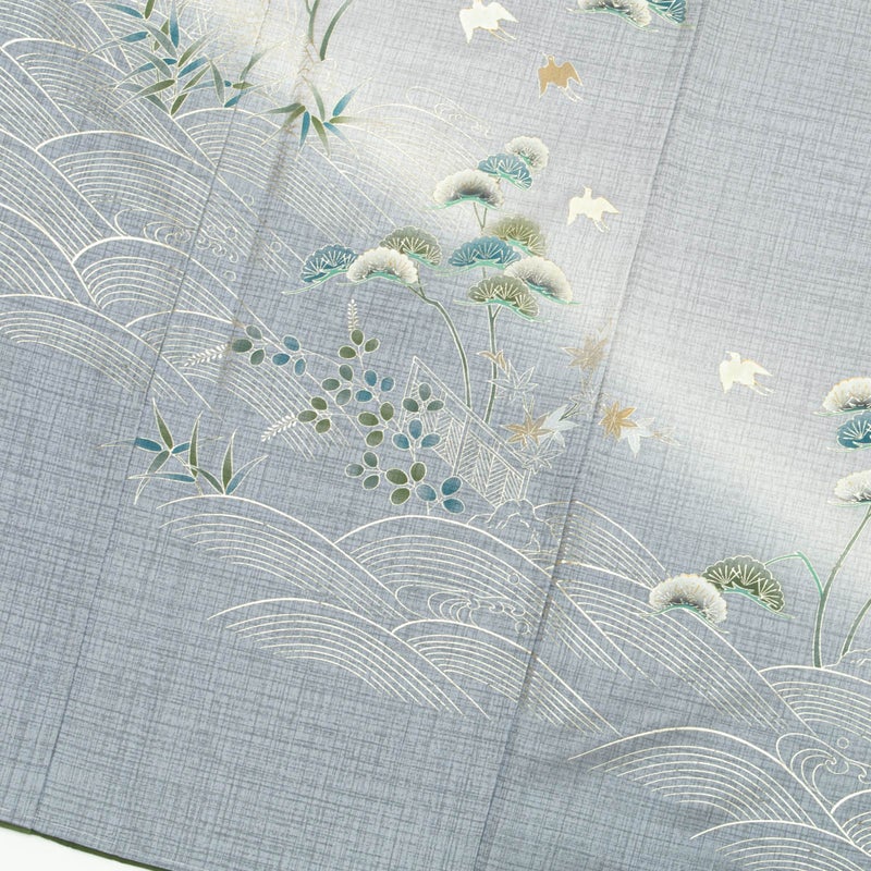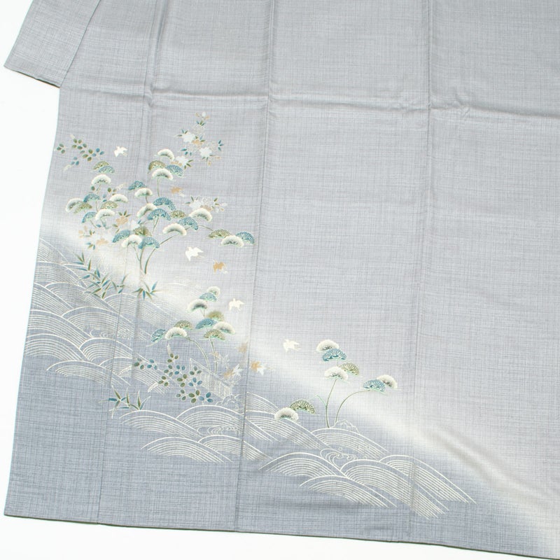 やわらかなグレーの地に、銀彩の波文と松、秋草が流れるように配された訪問着です。