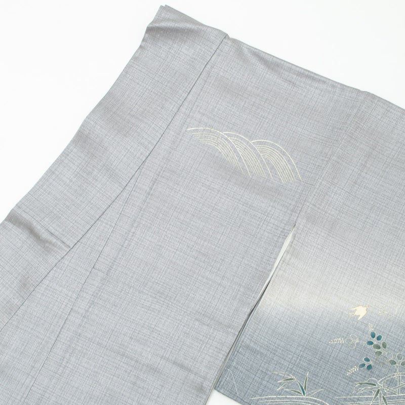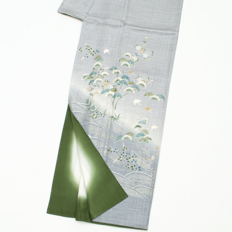 訪問着 友禅 銀彩 波文 千鳥 松 秋草 グレー 裾暈し 正絹 袷 身丈:約158cm 裄:約67cm