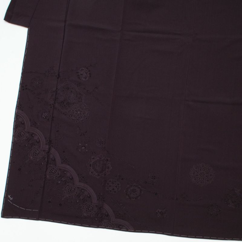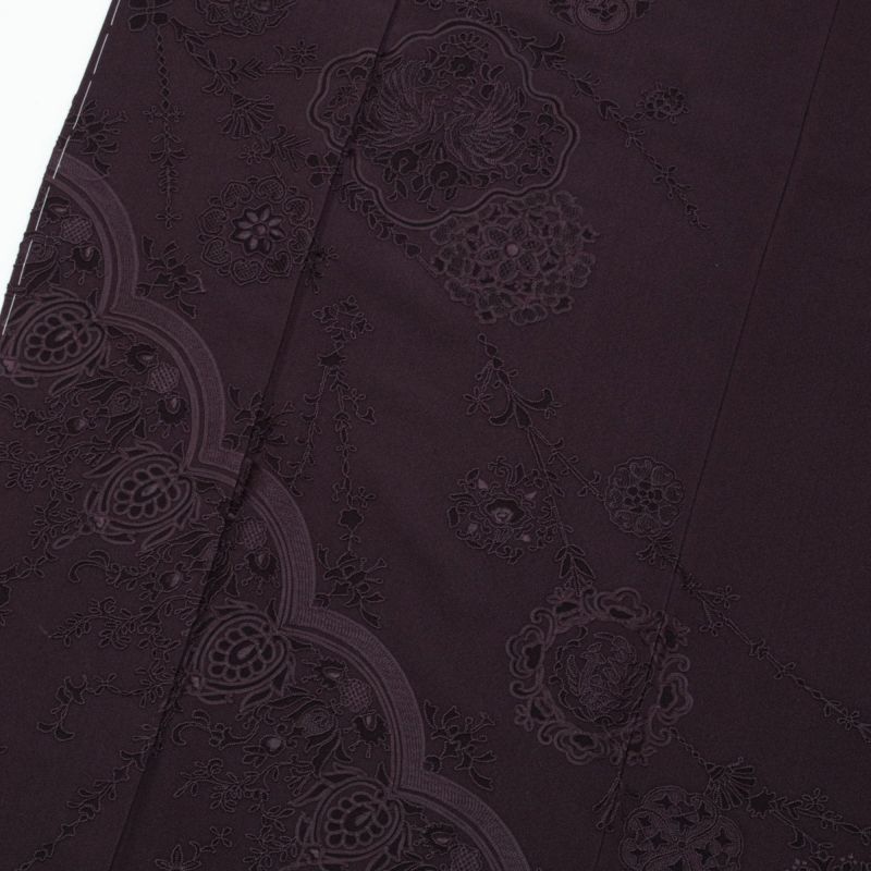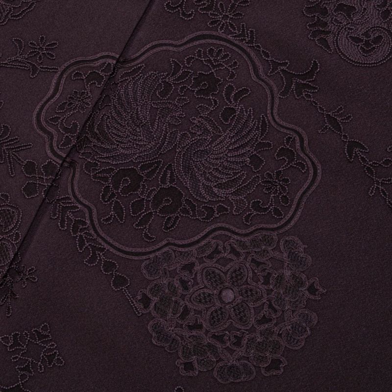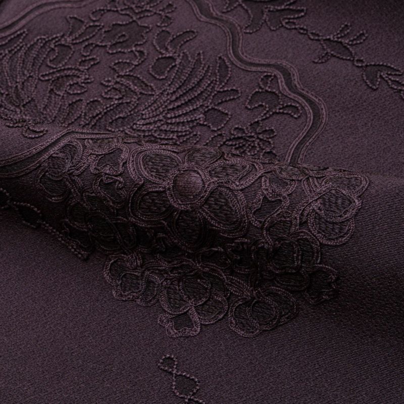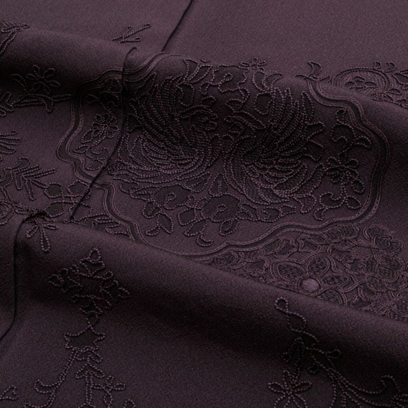 深みのある似せ紫の地色に同系色の唐花文様が浮かび上がるようにあしらわれ、落ち着いた華やかさを演出。