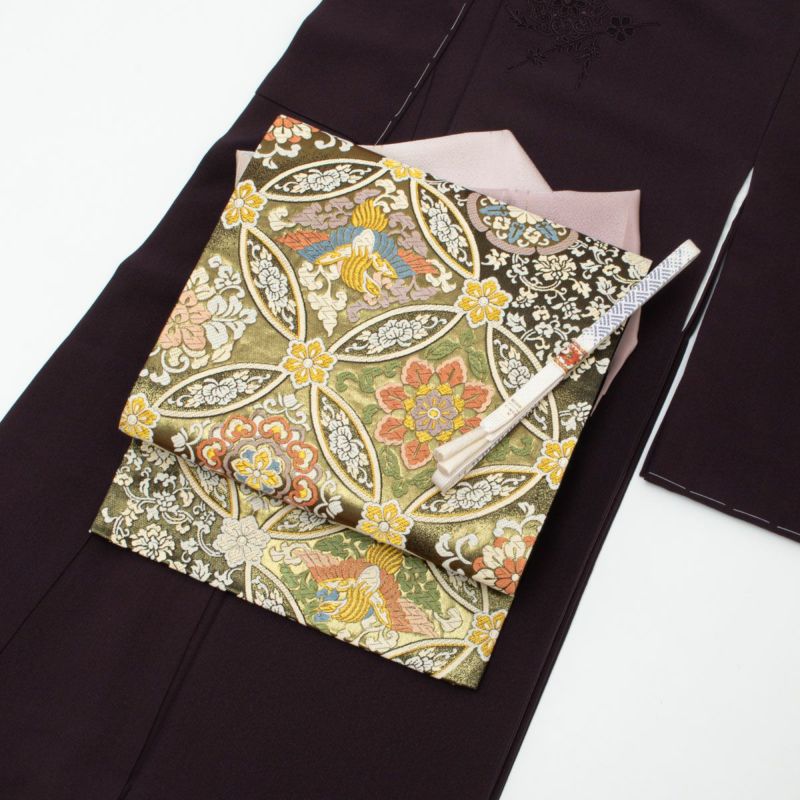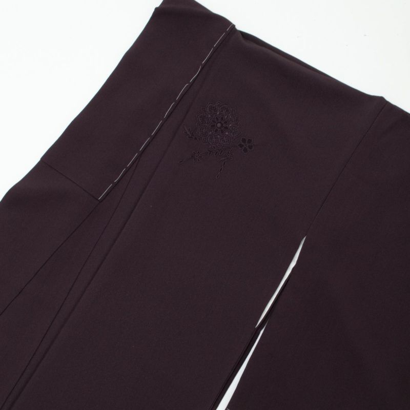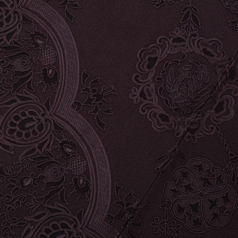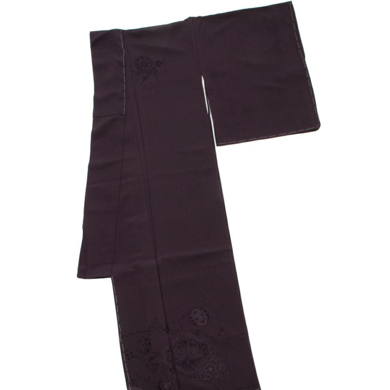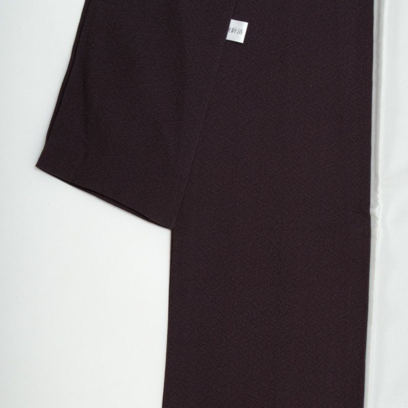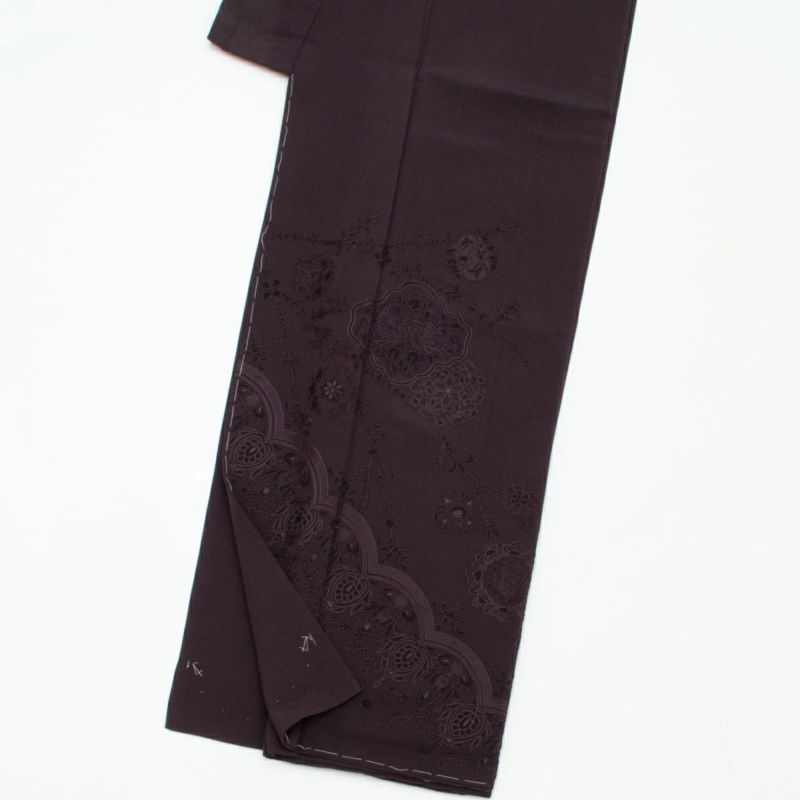 深みのある似せ紫の地色に同系色の唐花文様が浮かび上がるようにあしらわれ、落ち着いた華やかさを演出。